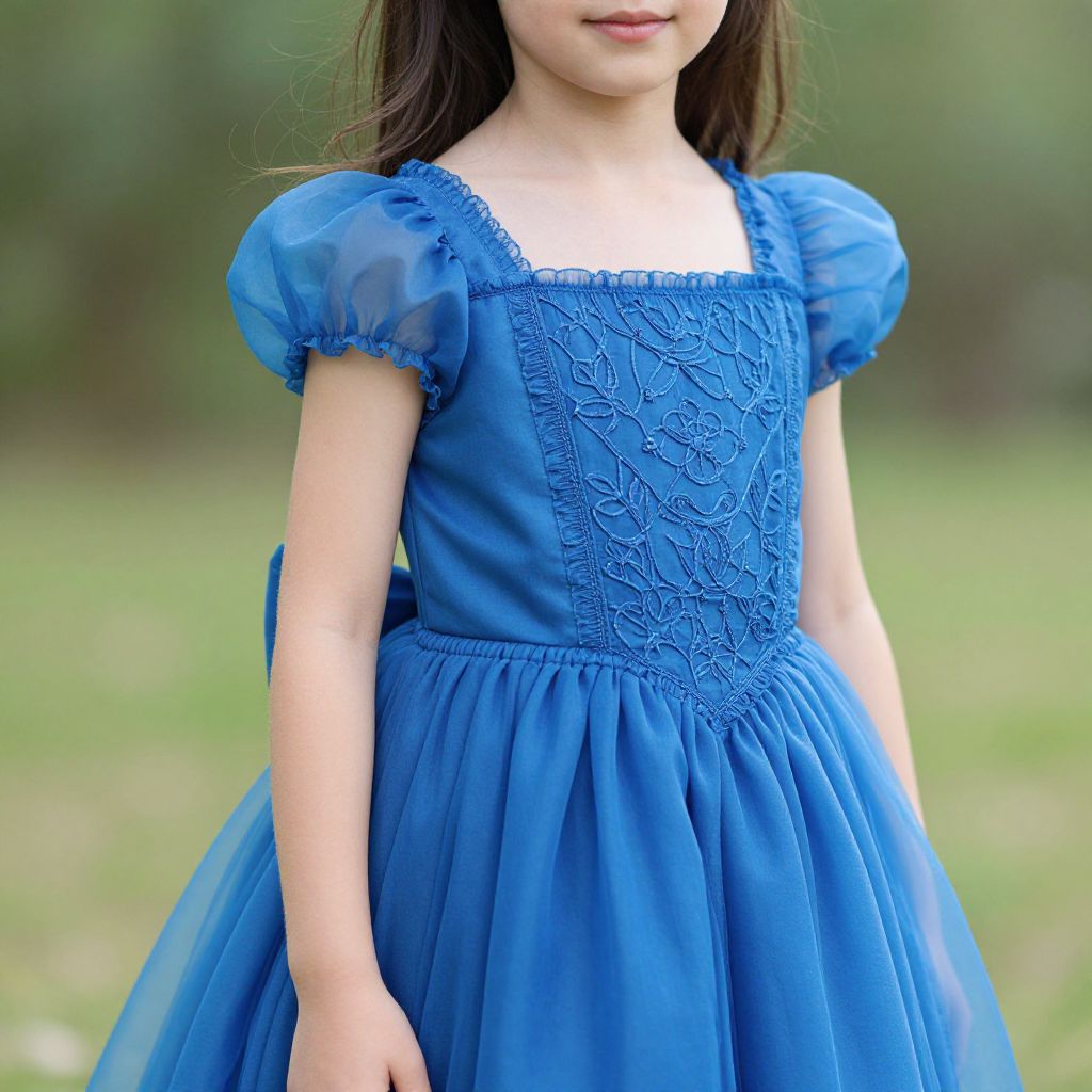 Photograph of a young girl with light skin and long brown hair, standing outdoors in a grassy area. She is wearing a vibrant blue, princess-style dress with puffed, sheer sleeves and intricate floral embroidery on the bodice. The dress has a square neckline and a full, flowing skirt. She is smiling slightly, but her face is partially out of frame. The background is blurred with green and brown hues, suggesting a natural, outdoor setting. The image focuses on the girl's upper body and dress, highlighting the rich blue color and delicate texture of the fabric.