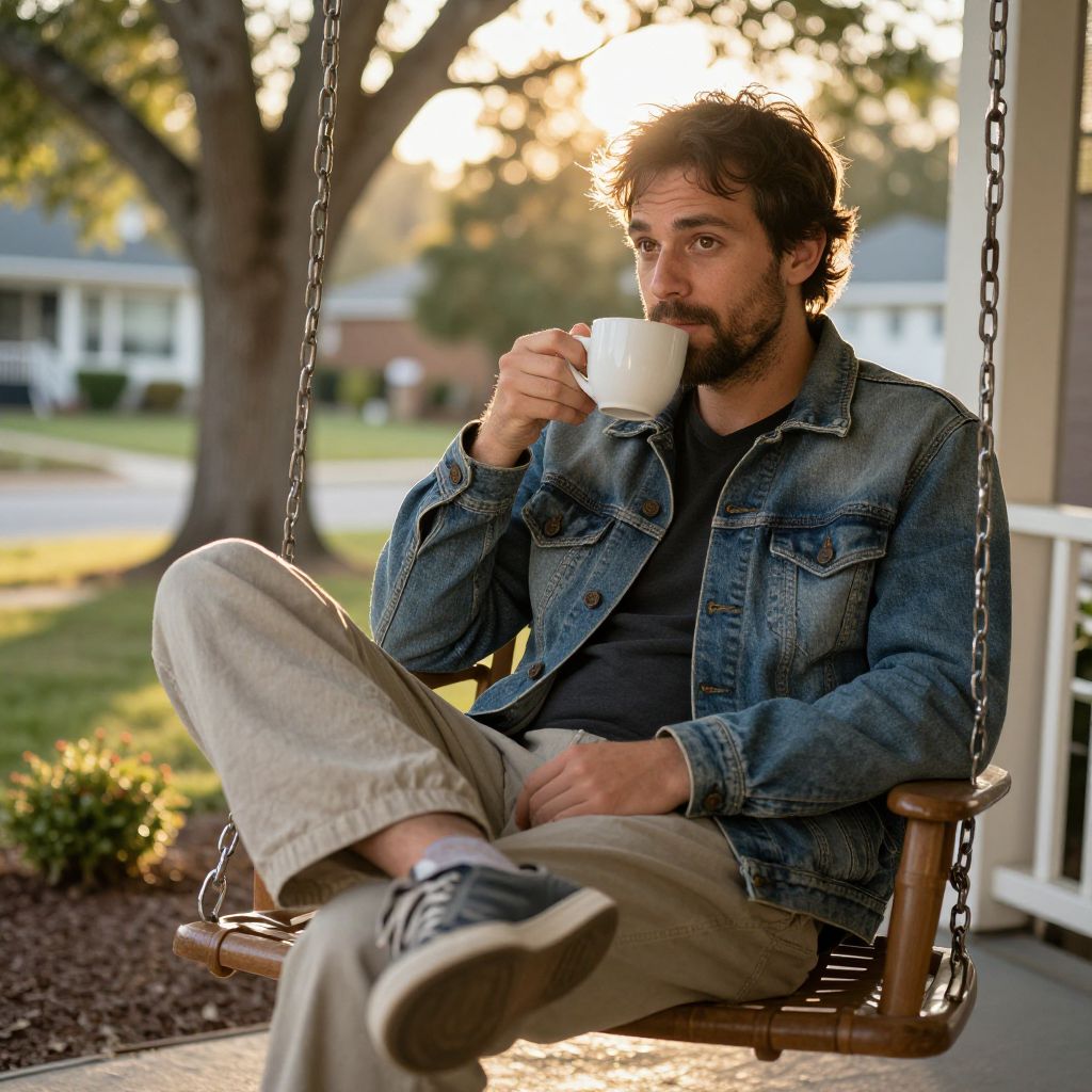 A relaxed man in his late 30s with warm brown eyes and a slightly tousled beard sits on a porch swing during a weekend afternoon, wearing a faded denim jacket, loose cotton pants, and sneakers, enjoying a cup of coffee as the golden hour sunlight filters through the trees in a quiet suburban neighborhood.