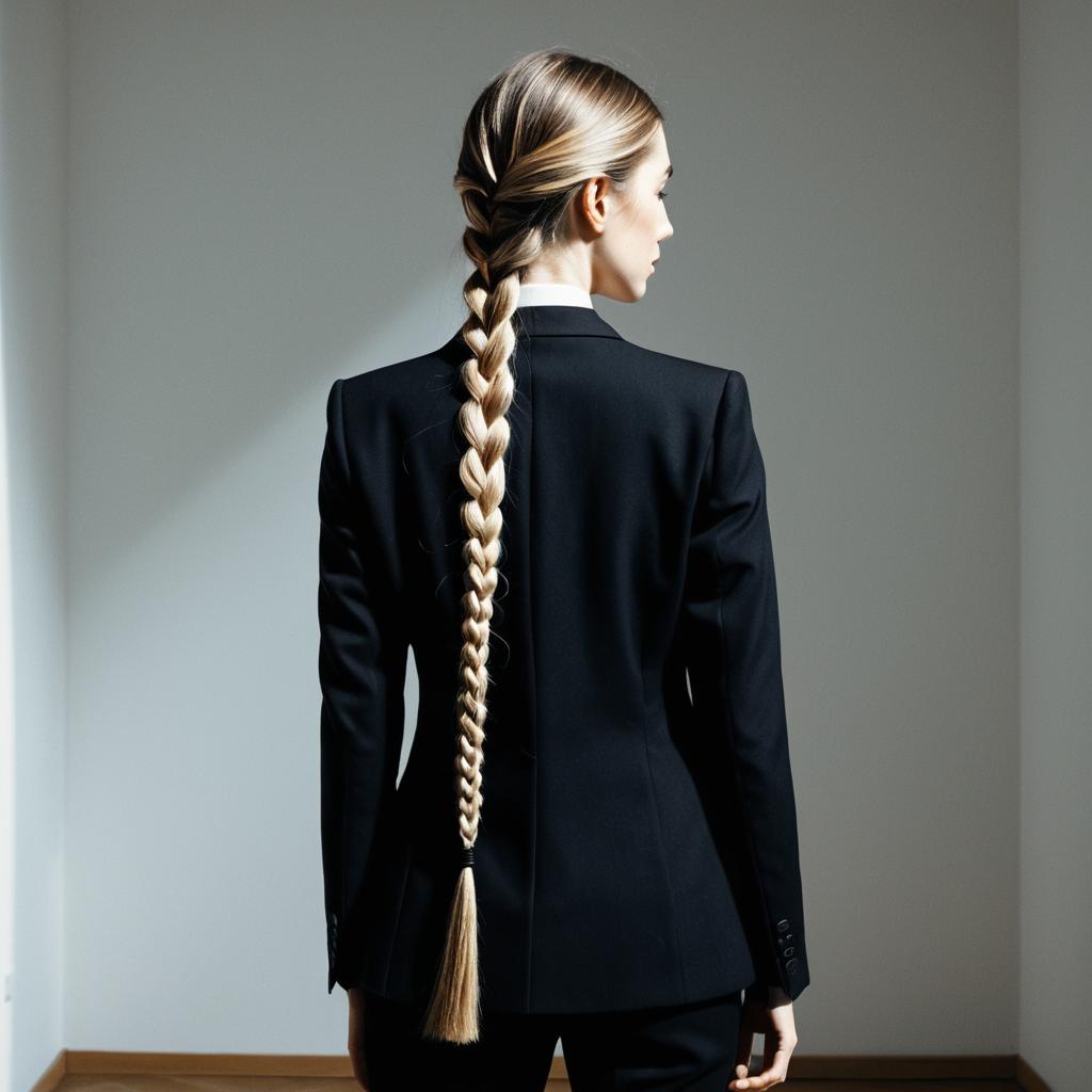 Rear view of a woman with long blonde Infinity Braid hairstyle wearing a minimalist black tailored suit standing in a white minimalist art gallery. The image is captured with dramatic spotlight lighting in a fashion editorial style.