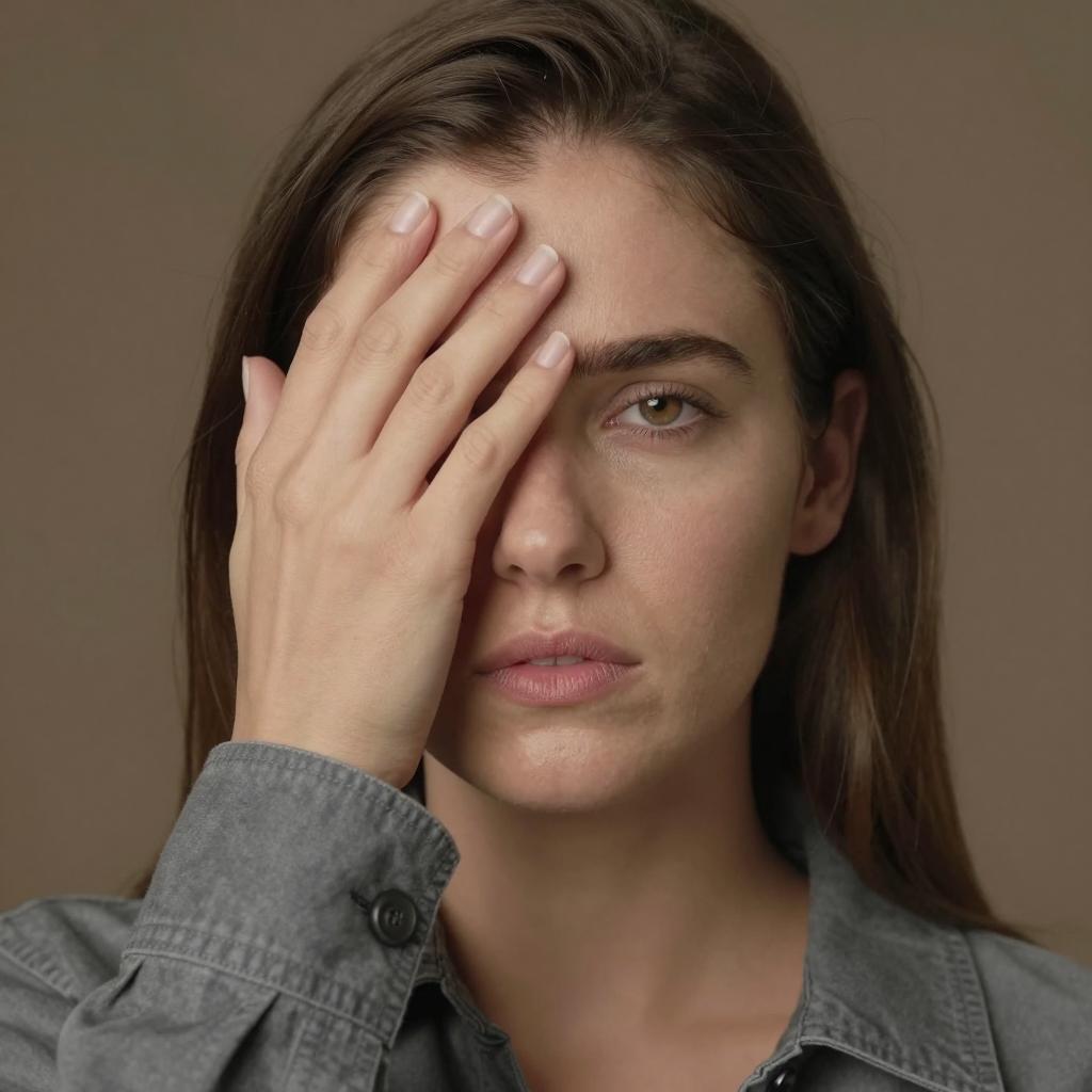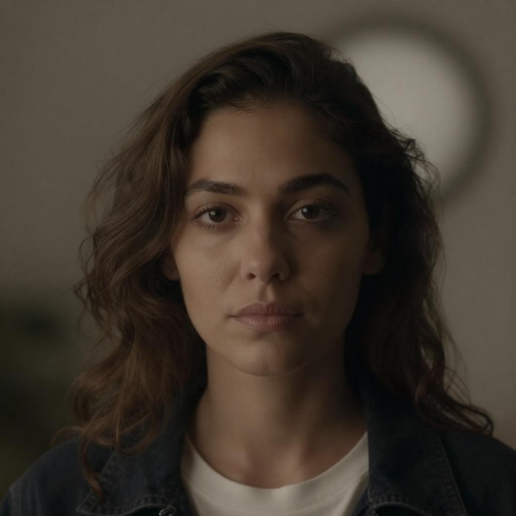 Close-up photograph of a serious-looking woman with green eyes, light brown hair, and slight freckles. Dark background, focused on her intense gaze, soft lighting on left side of face.
