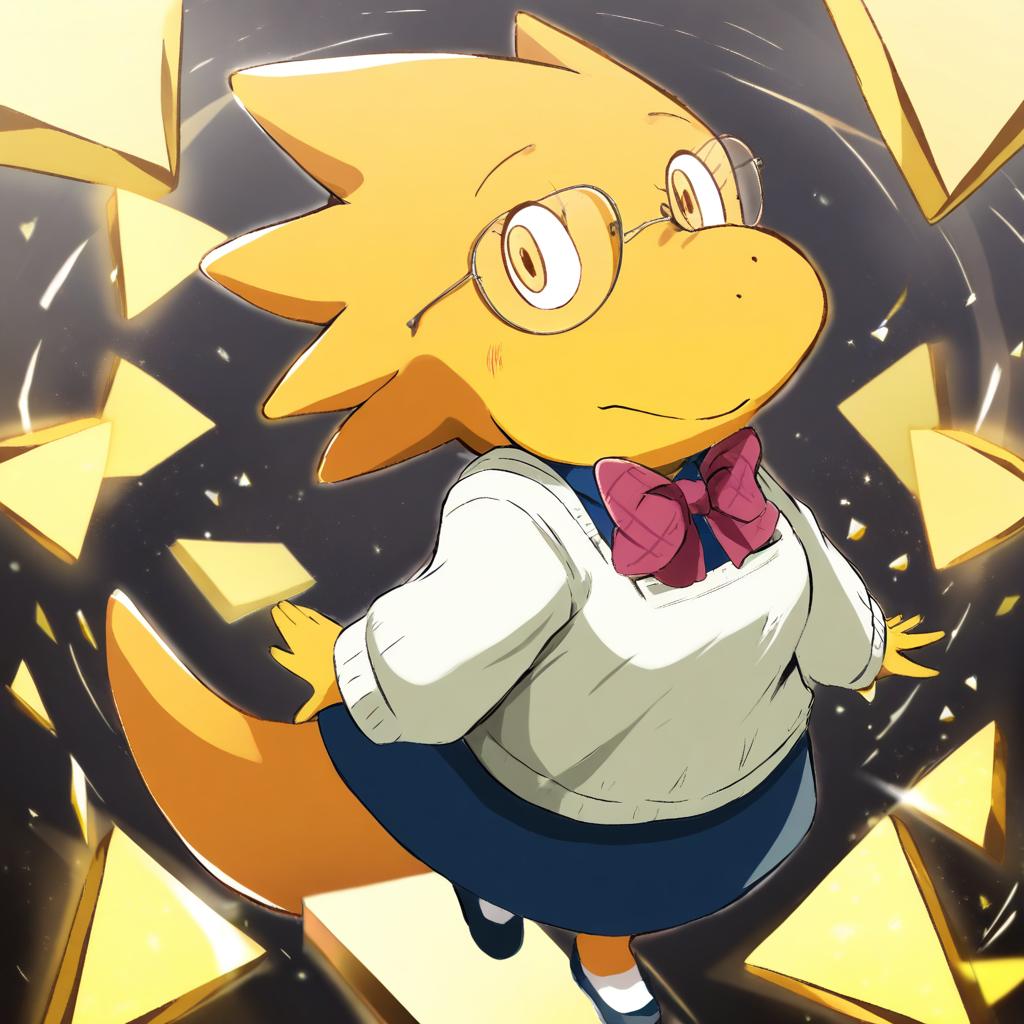 Digital illustration of Alphys, a character from Undertale, depicted as an anthropomorphic yellow reptilian with glasses and a tail. She is wearing a white sweater over a blue dress with a large pink bow tie, surrounded by floating golden geometric shapes on a dark swirling background. The art style is vibrant and detailed, inspired by anime aesthetics.