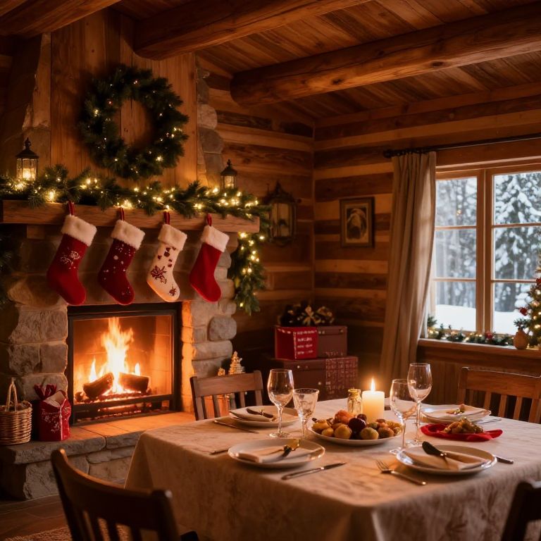 Cozy Christmas dinner in a wooden cabin: lit fireplace, Christmas stockings, decorated table with candles, wine glasses, and fruit, snowy window view.