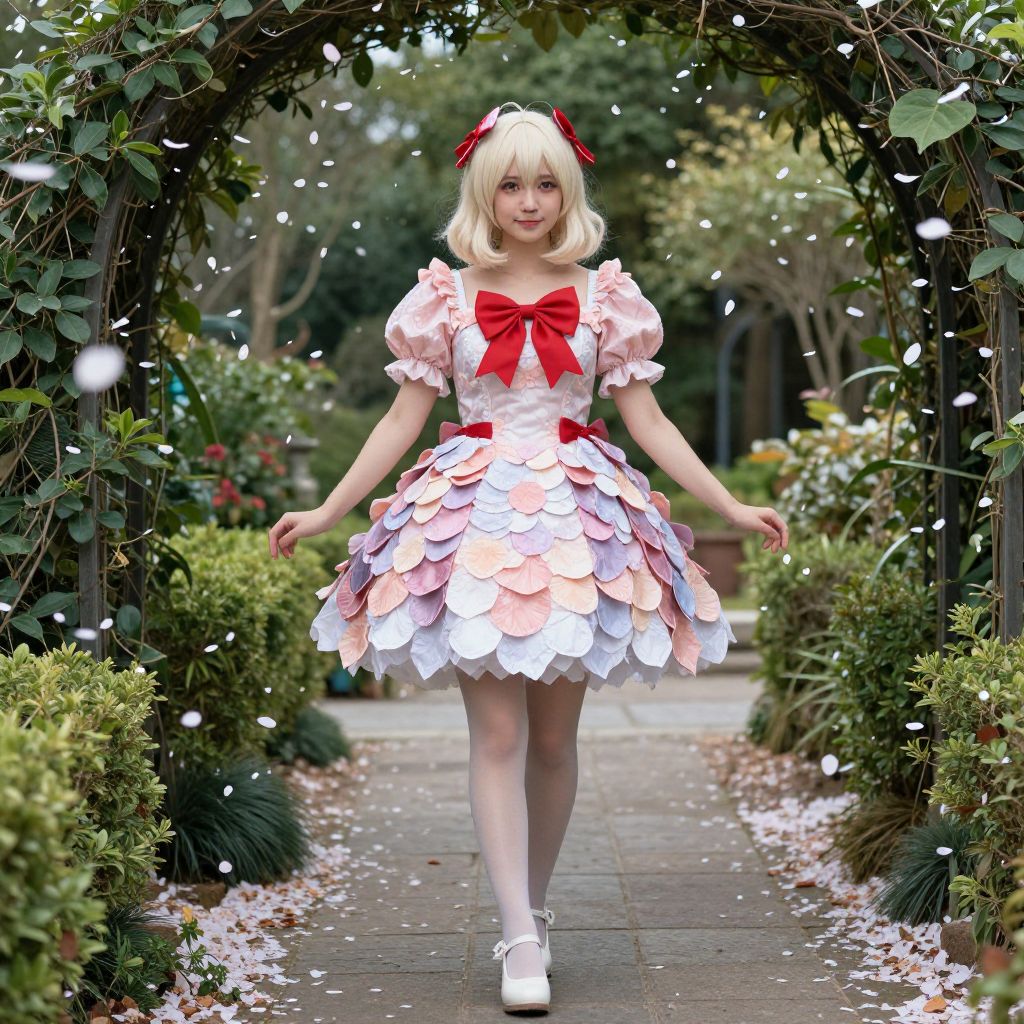 A woman is dressed in a floral petal-inspired costume, featuring a layered dress with puffed sleeves and a red bow accent on the bodice. She stands on a garden pathway surrounded by lush greenery and falling flower petals, embodying a whimsical and romantic cosplay style.