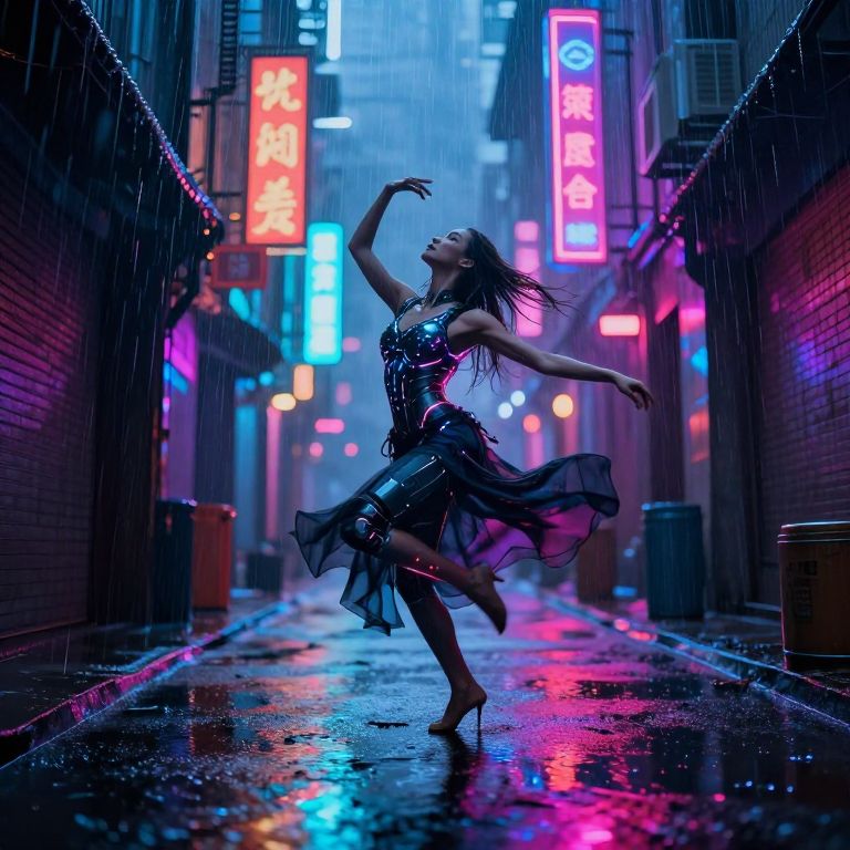 A mesmerizing digital artwork fuses impressionistic techniques with cyberpunk elements to create an atmospheric scene. The central focus is on a captivating dancer, her form adorned with glowing cybernetic enhancements. As she moves gracefully through the downpour-drenched streets, her performance illuminates the neon-lit alleyway, casting vibrant, shifting hues across the wet asphalt. From a low vantage point, the viewer's gaze is drawn to the interplay of light and shadow, as well as the fusion of ancient kanji signs with modern technology, all set against the backdrop of dripping eaves, evoking both wonder and introspection.