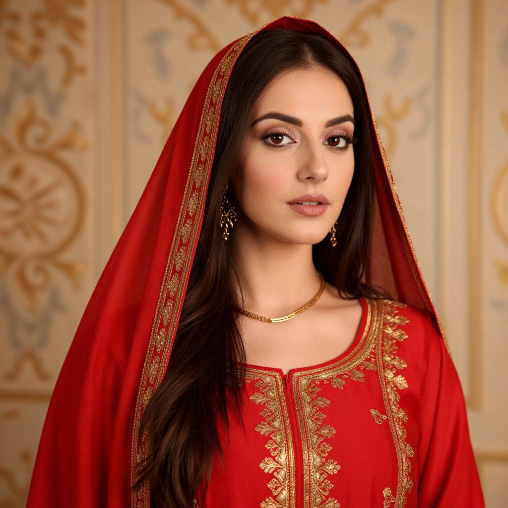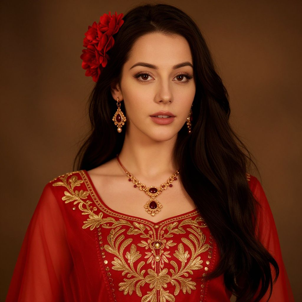 A woman with long black hair is wearing a pink outfit with gold embroidery and a red necklace.