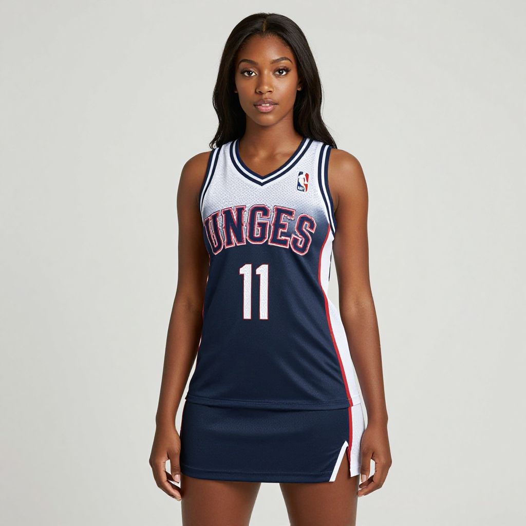 "woman nba jersey dress, solo, 1girl, black hair, dark skin, long hair, sportswear, realistic, dark-skinned female, basketball uniform, dress Realistic photo of casual sexy person with pretty face"