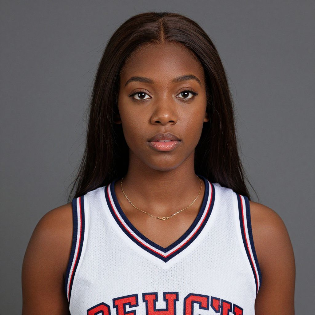 Photograph of a young Black woman with long, straight black hair standing against a plain white background. She is wearing a white and navy blue WNBA basketball jersey with "WNBA" in bold letters across the chest and the number "11" in white below. The jersey features red and white stripes on the sides. She has a confident expression with slightly parted lips and is looking directly at the camera. Her arms are relaxed by her sides, and she is wearing no additional accessories or jewelry. The lighting is even, highlighting her smooth, dark skin and the jersey's fabric texture.