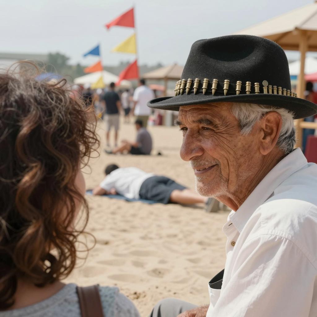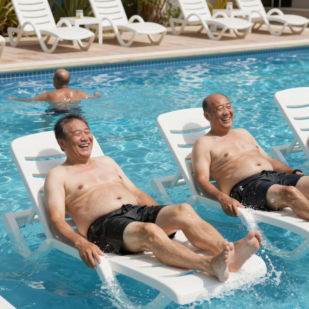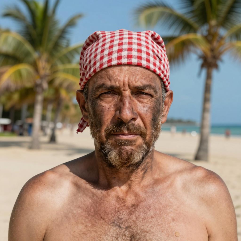Three middle-aged, shirtless men standing on a beach, holding towels. First man on left has dark hair, smiling, black swim trunks. Middle man with balding head, yellow towel, smiling. Right man with gray hair, sunglasses, beard, blue and white towels. Background includes blue sky, white building, other beachgoers. Bright daylight.