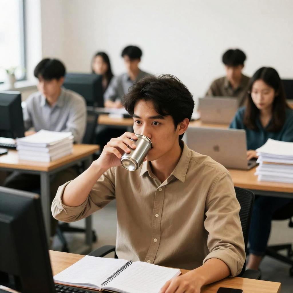 Photograph of a young man with medium-length dark hair, wearing a black cap and black shirt, sitting at a desk. He is typing on a silver MacBook, with a stack of white books in front of him. Sunlight streams through a window in the background, illuminating a bookshelf with various items.