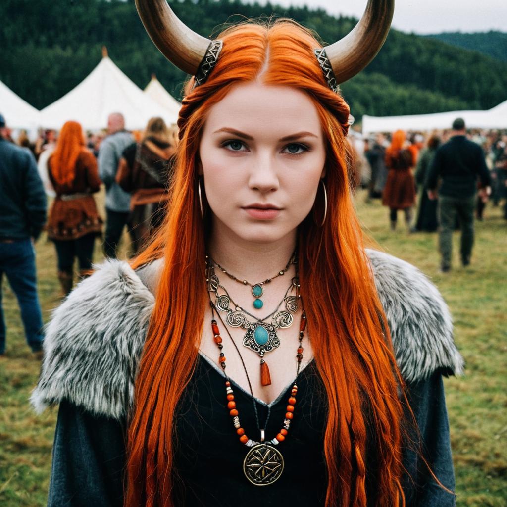 Viking festival costume,1girl, jewelry, long hair, horns, necklace, red hair, solo focus, outdoors, orange hair, solo, looking at viewer