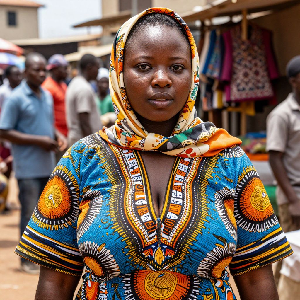 Photograph of a dark-skinned African woman standing in a bustling outdoor market. She wears a vibrant, colorful, short-sleeved dress adorned with intricate patterns in blue, orange, yellow, and black, and a matching headscarf. The dress features bold, circular orange designs and white, abstract patterns. Her expression is serious and she gazes directly at the camera. In the blurred background, several people of various ages and genders, dressed in casual clothes, are walking and shopping. Market stalls with colorful fabrics and goods are visible to the right. The sunlight casts bright, natural light over the scene.