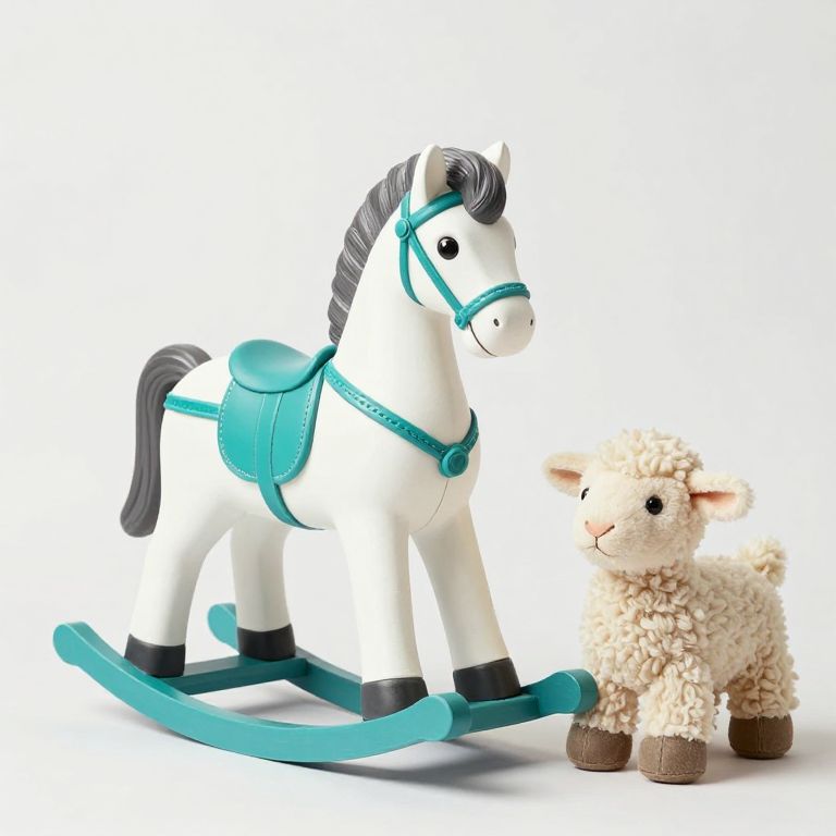 Photograph of a white plastic rocking horse with a teal bridle and saddle, and teal rockers, standing beside a fluffy, cream-colored sheep toy. The rocking horse has black mane and tail accents, while the sheep has small, black eyes and brown hooves. Both toys are positioned against a plain white background, emphasizing their bright colors and contrasting textures. The image is bright, with sharp details and a clean, minimalist style.