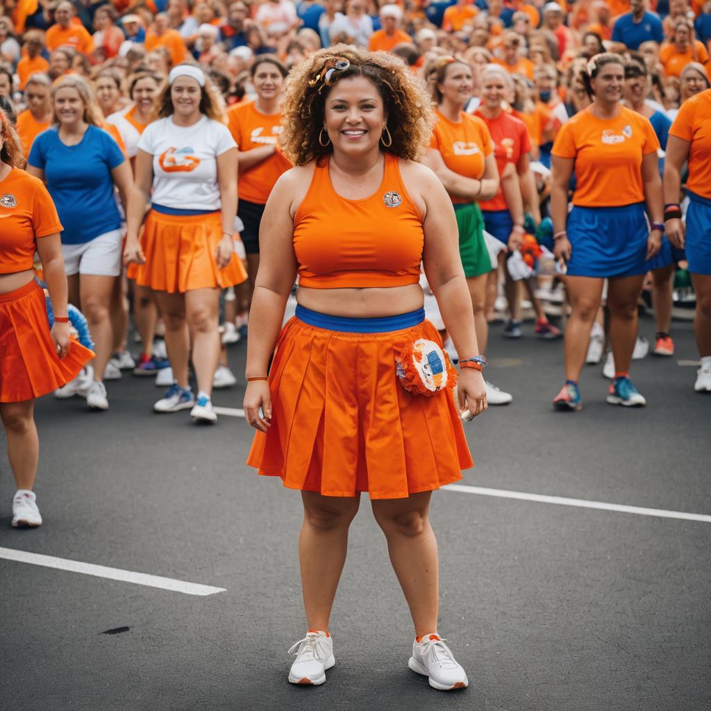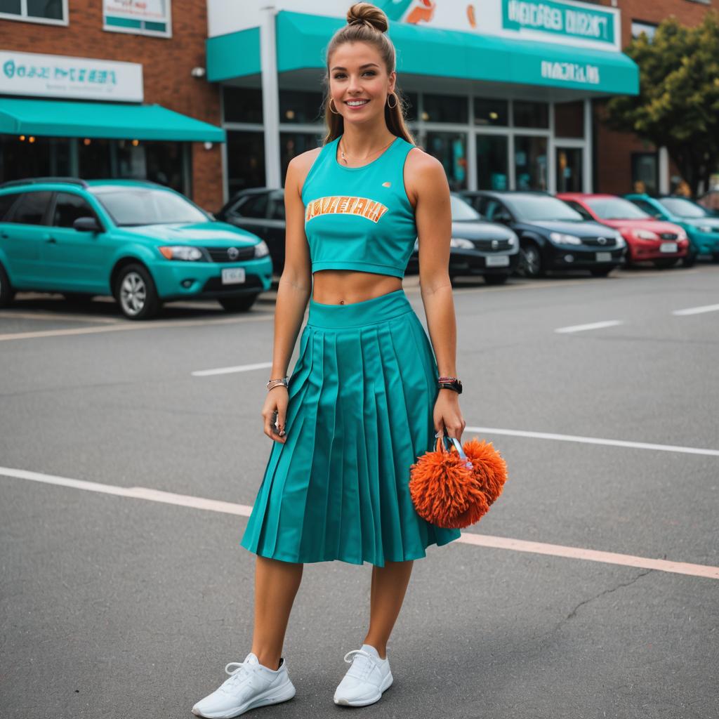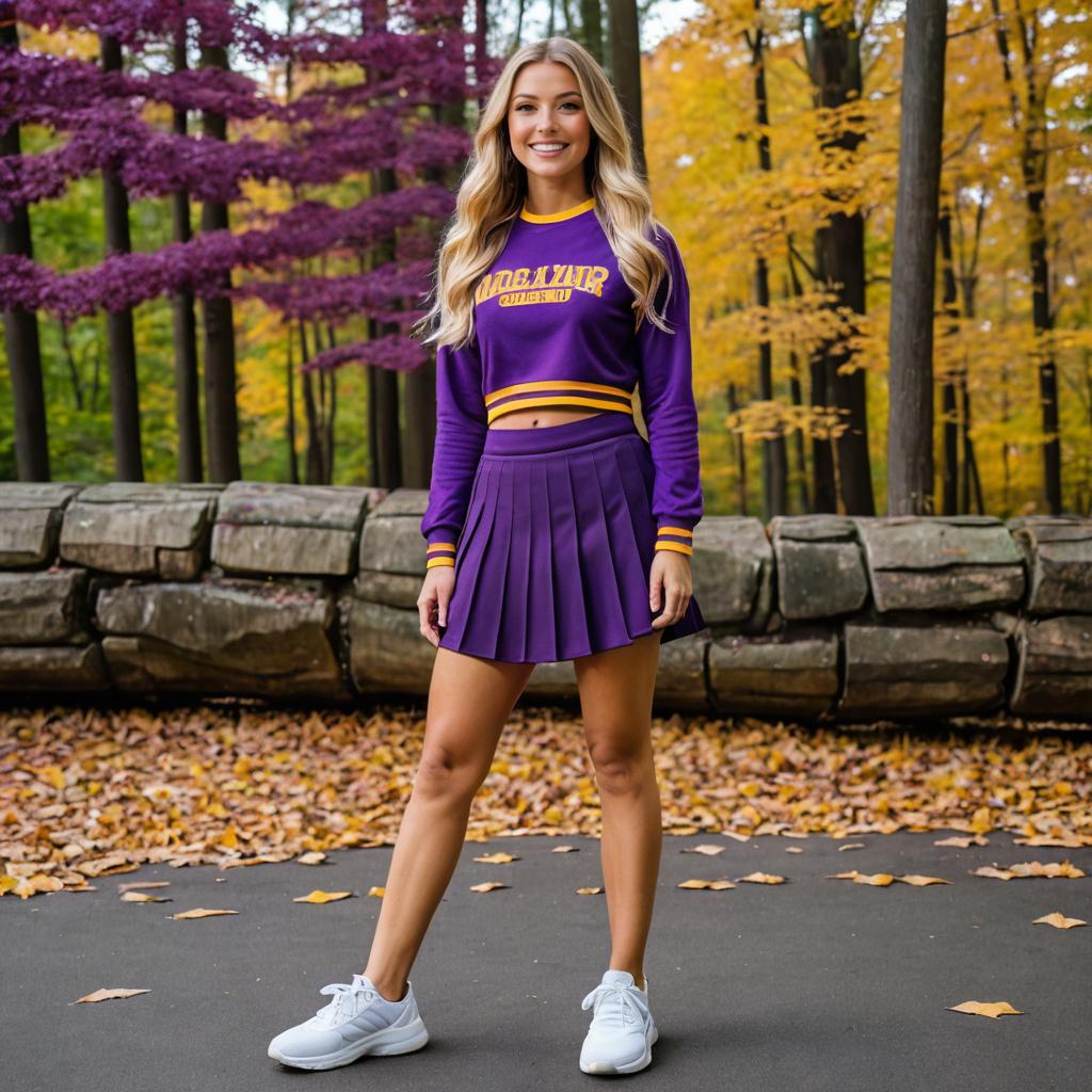 Woman in Purple Cheerleader Outfit with Pom-Poms