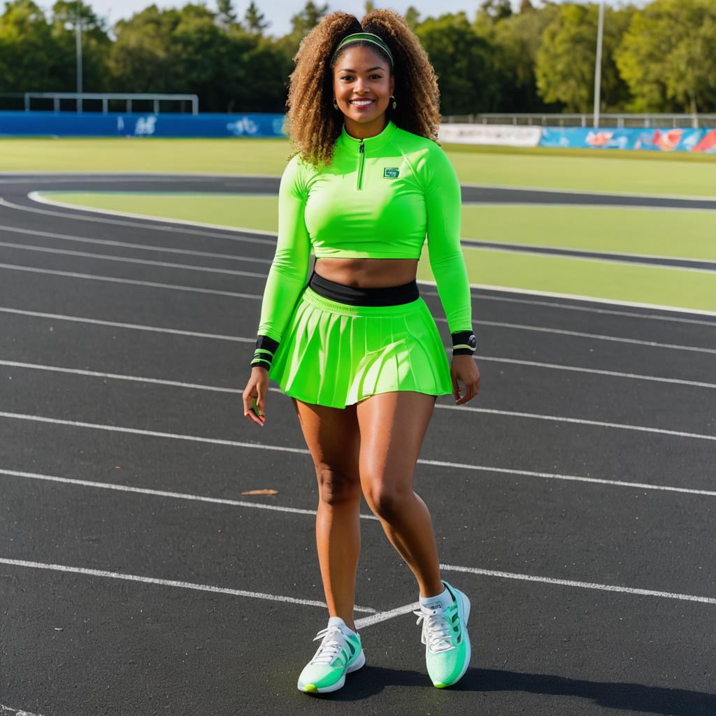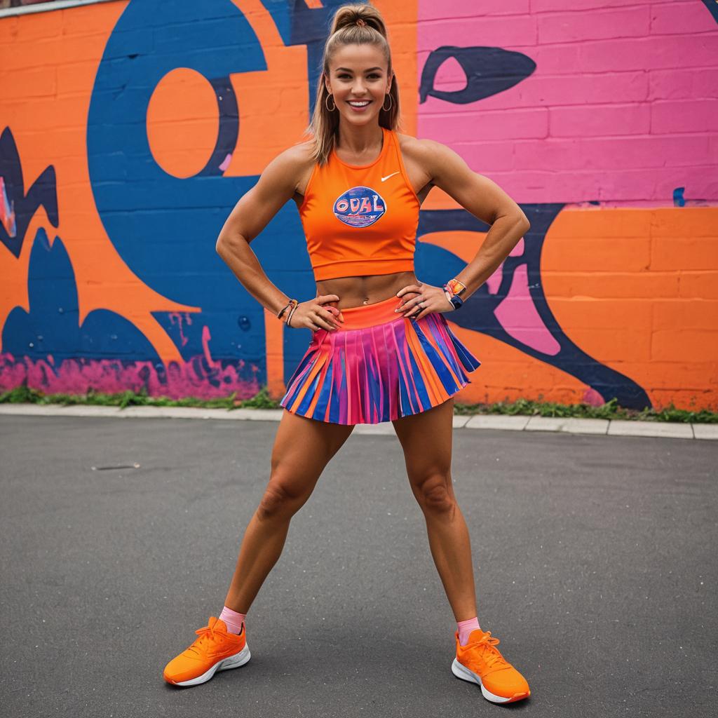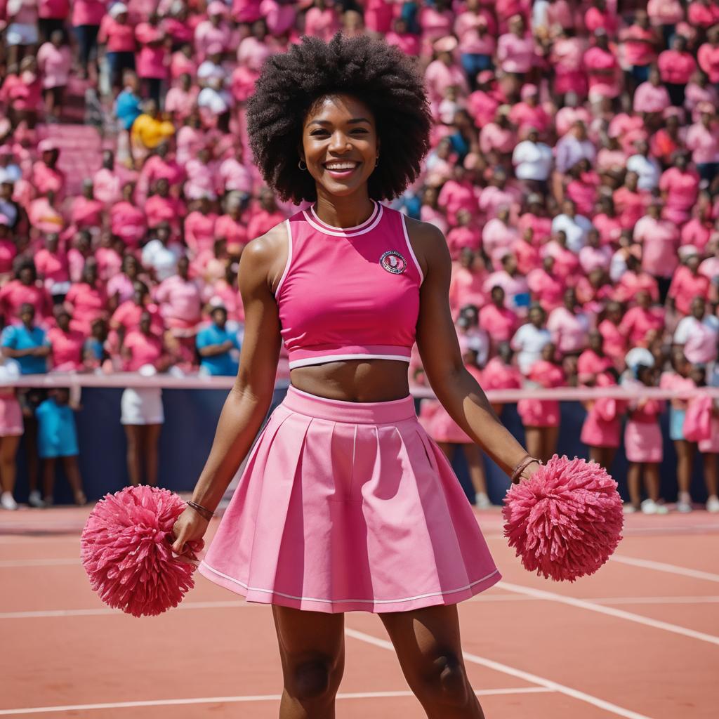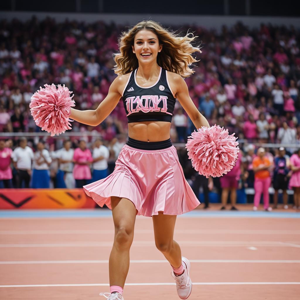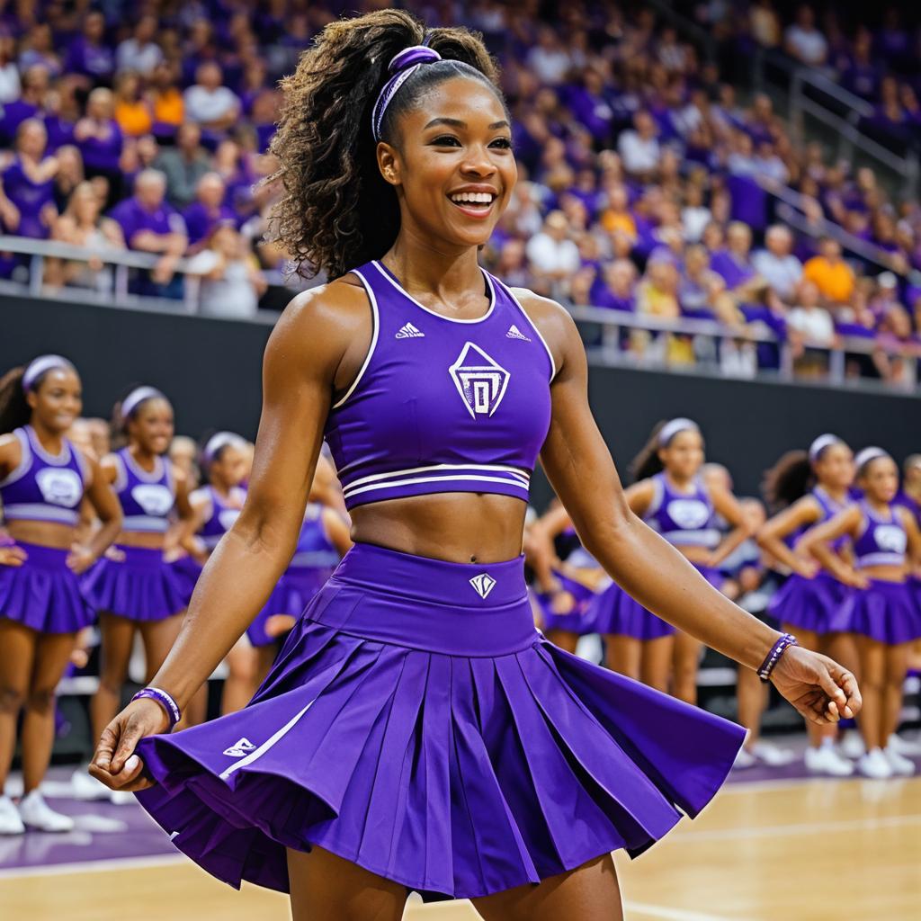 Photo of a Framed Lithe Appearance woman, Bohemian Waves, cheerleader outfit, pleated Plum Purple skirt, crop top in Bamboo, vibrant colors, polyester, athletic style, Cutout Ankle Boots, pom-poms, team logo, energetic, youthful, arcade, illustrated aesthetic