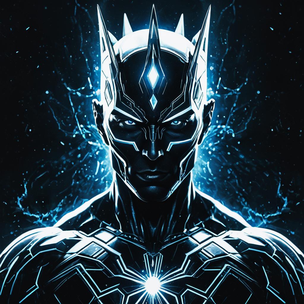 Digital artwork of a bald, futuristic warrior with a glowing crown and intricate armor. The character features sharp facial details, intense eyes, and an illuminated chest piece, set against a dark, abstract background with blue glowing effects. The image combines elements of sci-fi and mysticism with high realism and digital laser painting techniques.