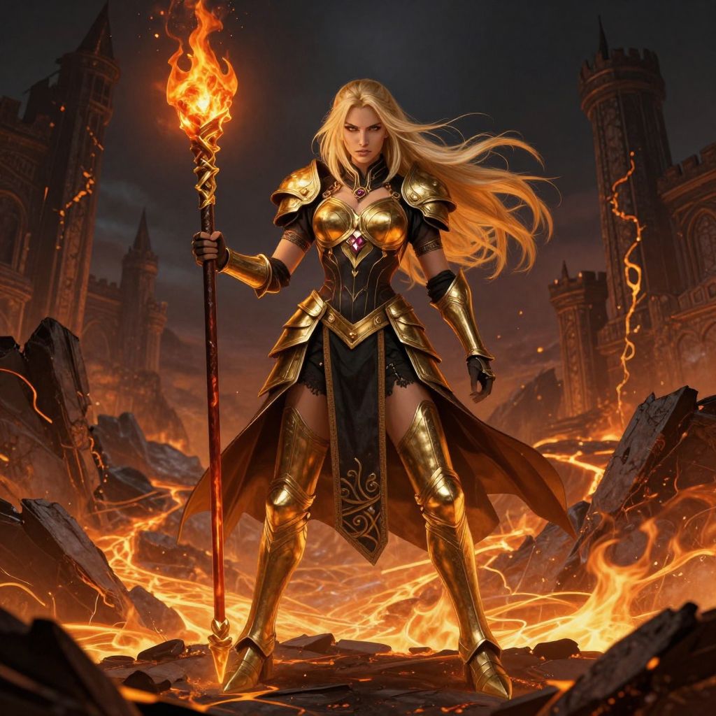 A digital art piece of a fierce, blonde warrior woman with long hair, standing in a fiery, ruined landscape. She's wearing golden, ornate armor with black accents and holding a flaming staff in her right hand. Her intense gaze and confident stance command attention. Dark, gothic-style castles loom in the background, with a glowing, lava-filled river running through the scene.