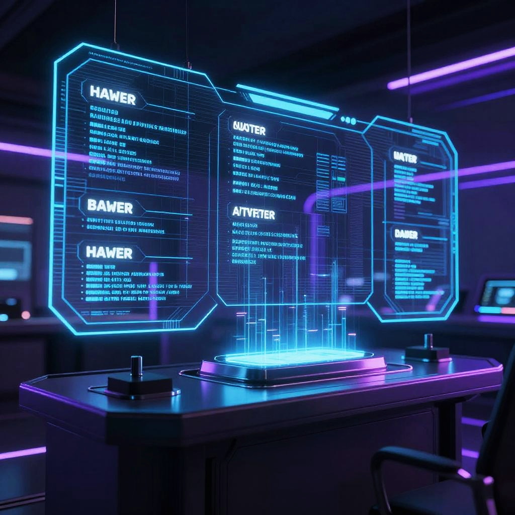 Titles forming a futuristic holographic interface in a dark sci-fi control room, neon blue and purple lights illuminating sleek metallic surfaces, digital data streams flowing around, cyberpunk aesthetic with sharp contrasts