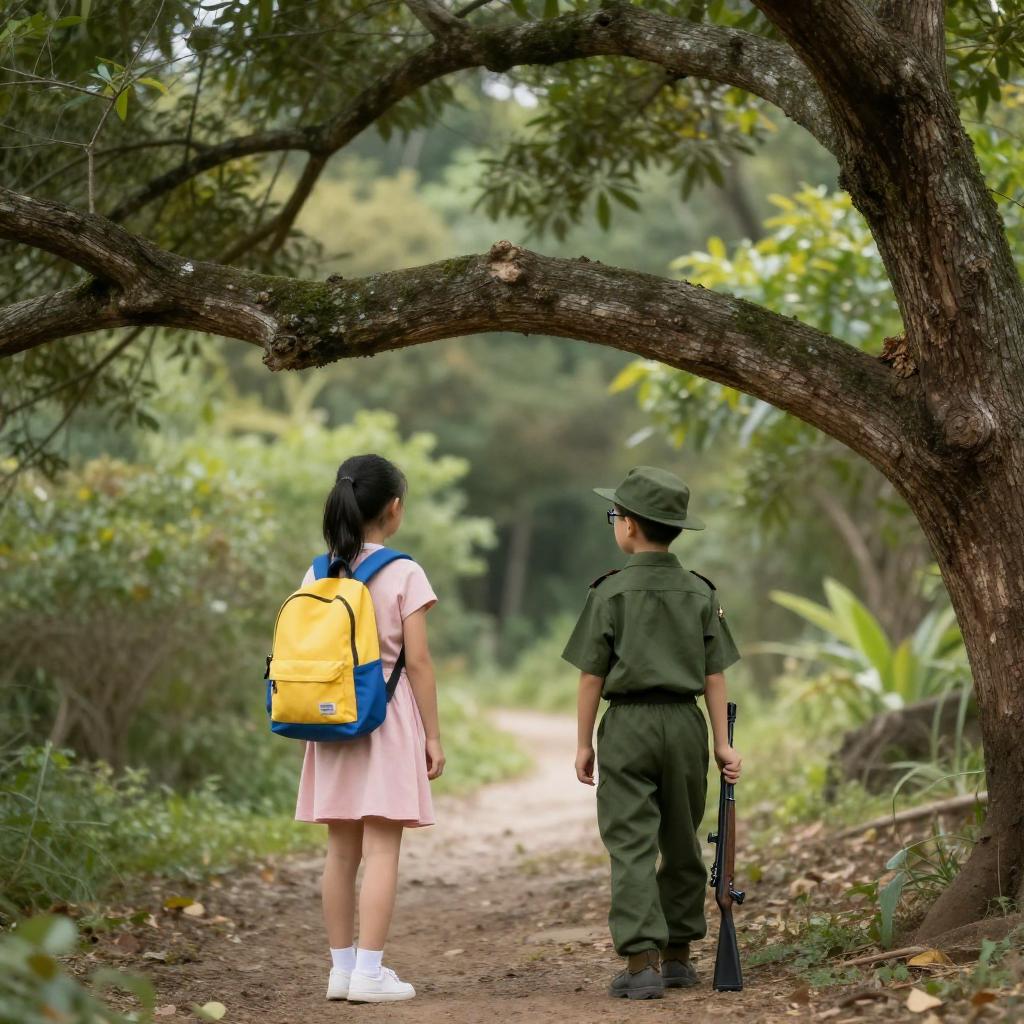 Two children navigating a forest path under a large, curved tree branch. The girl on the left wears a pink dress, white socks, and carries a yellow and blue backpack. The boy on the right wears a green uniform, glasses, a hat, and holds a rifle. Bright green foliage fills the background.