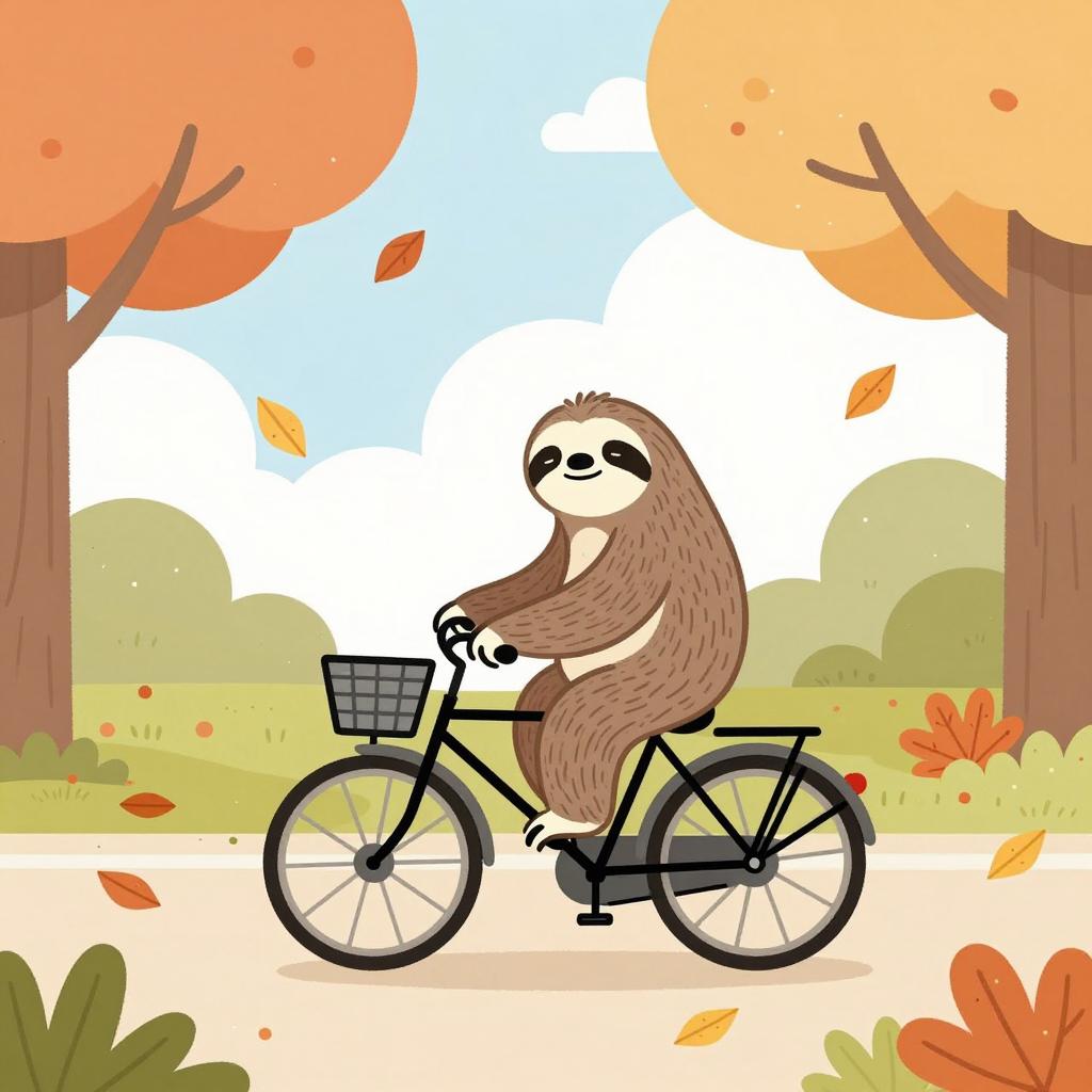 Illustration of a relaxed sloth riding a vintage bicycle through a sunny park filled with colorful autumn leaves. The artwork features minimalist line art and a humorous, whimsical style inspired by Gemma Correll, with falling leaves and vibrant trees creating a cheerful fall atmosphere.