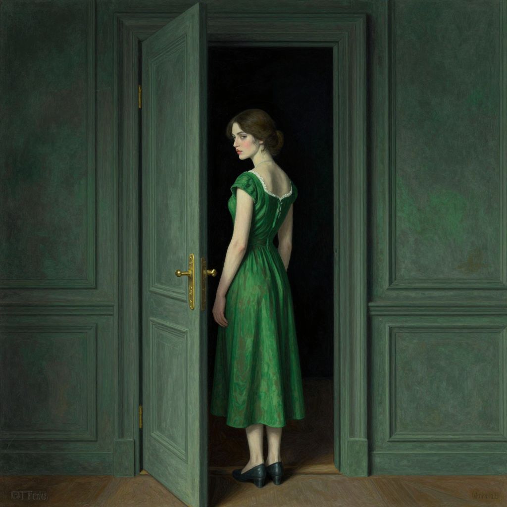 A photograph of a fair-skinned woman with dark brown hair, standing in a dimly lit doorway, framed by two green, paneled wooden doors. She wears a green, vintage-style dress with short sleeves and a square neckline, paired with black shoes. Her back is to the viewer, head turned slightly to the side, looking over her shoulder with a contemplative expression. The room has textured green walls and a wooden floor. The door is ajar, revealing darkness beyond. The lighting creates a dramatic contrast, highlighting her figure and the green hues of her dress and surroundings. The image has a soft, painterly quality.