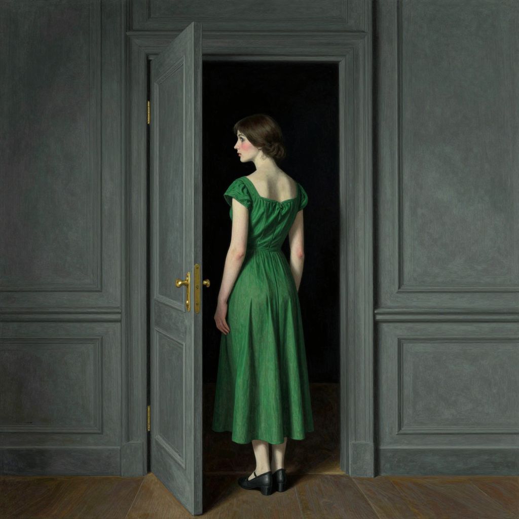 A surrealist-inspired digital artwork featuring a woman in a green dress standing at an open doorway, her back turned to the viewer, evoking a sense of mystery and contemplation reminiscent of Paul Delvaux's style.