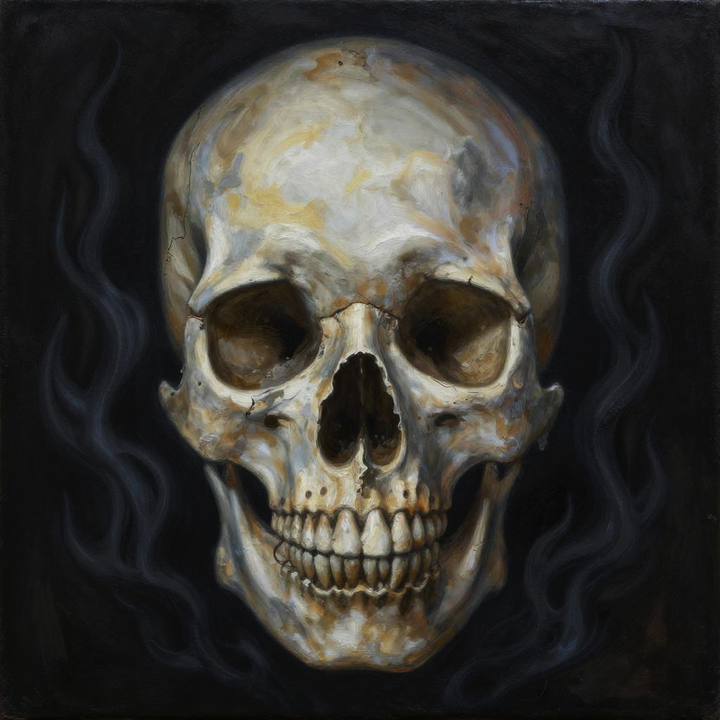A digital painting of a realistic human skull with a dark, eerie background. The skull, rendered in shades of white and gray, has hollow eye sockets, a prominent nasal cavity, and a set of teeth showing a slight, sinister grin. Dark, swirling smoke-like patterns envelop the skull, adding a supernatural aura. The background is solid black, making the skull the focal point. The texture of the skull is detailed, with subtle shadows and highlights enhancing its three-dimensional appearance. The overall style is gothic and haunting, evoking a sense of mortality and mystery.