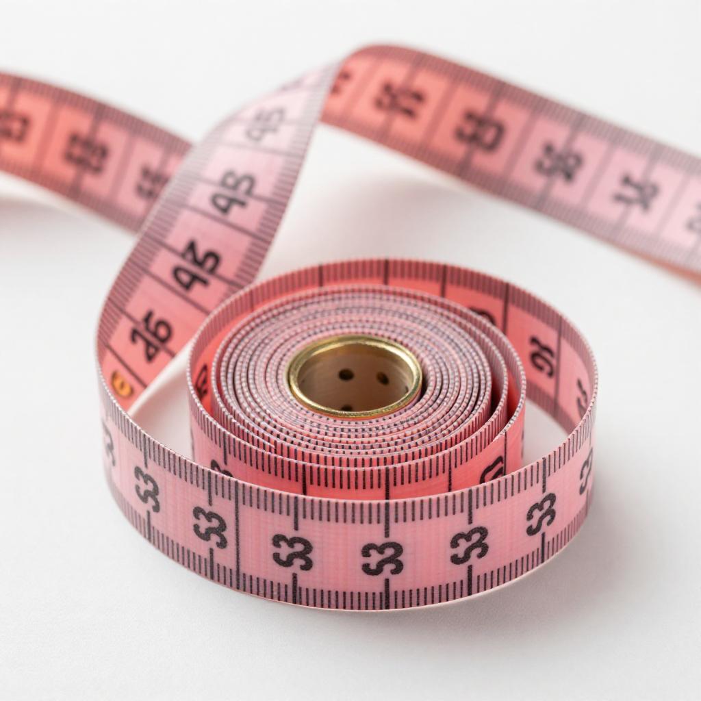 Photograph of a pink measuring tape coiled in a loose spiral against a white background. The tape is brightly lit with even, soft lighting that eliminates shadows. The camera angle is slightly above and to the side, capturing the full length of the tape. The background is completely blurred, emphasizing the measuring tape. The depth of field is shallow, keeping the tape in sharp focus.