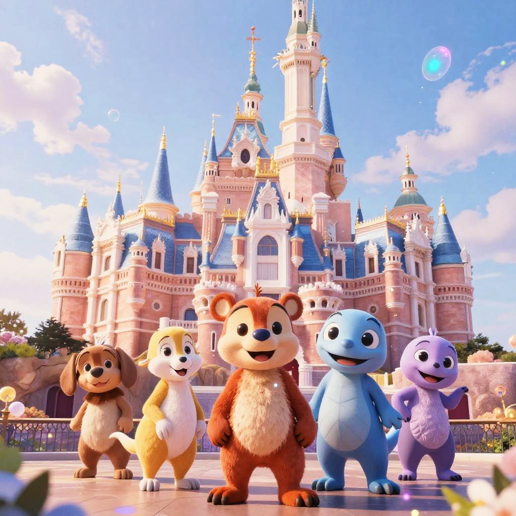 How to make disney ai poster featuring charming AI characters designing a dreamy Disney-themed poster on a holographic canvas, surrounded by iconic Disney castle silhouettes, soft pastel colors with glowing light effects, imaginative digital artwork