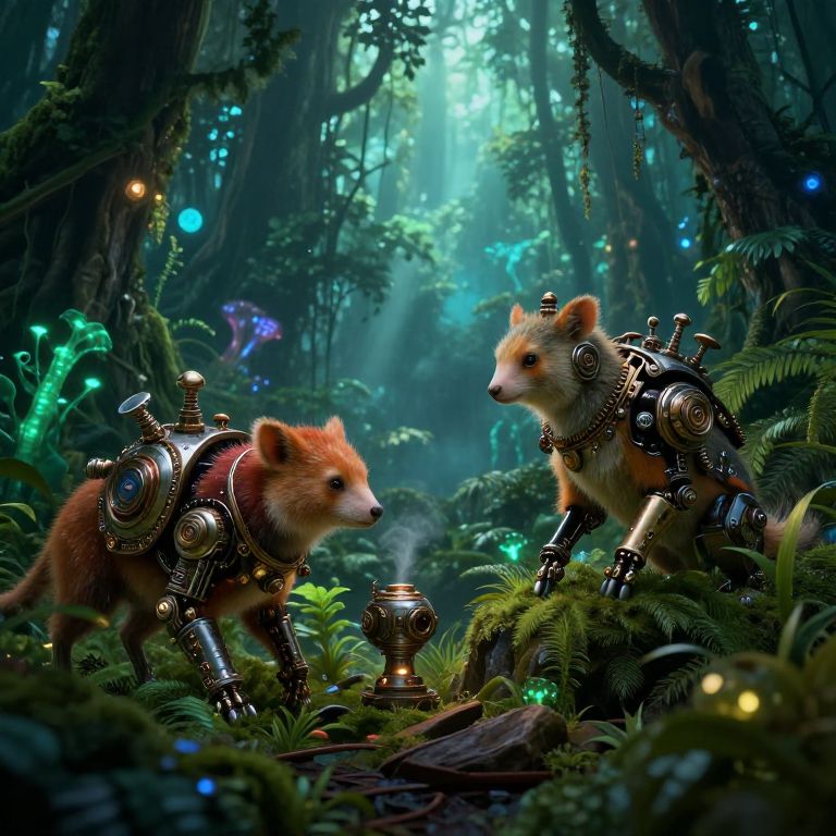 Animal generators creating fantasy creatures in a lush rainforest setting, bioluminescent plants illuminating the scene, animals with mechanical enhancements, steam-punk inspired devices emitting soft glows, vibrant colors, intricate textures on fur and metal, mist rising from the forest floor.