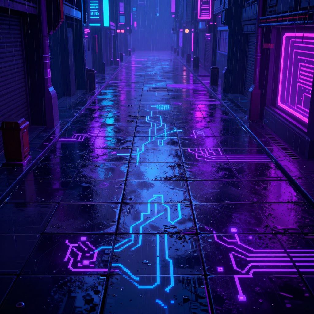 Neon-lit, cyberpunk alleyway at night with glowing blue and purple circuit patterns on wet, reflective pavement, surrounded by illuminated neon signs and