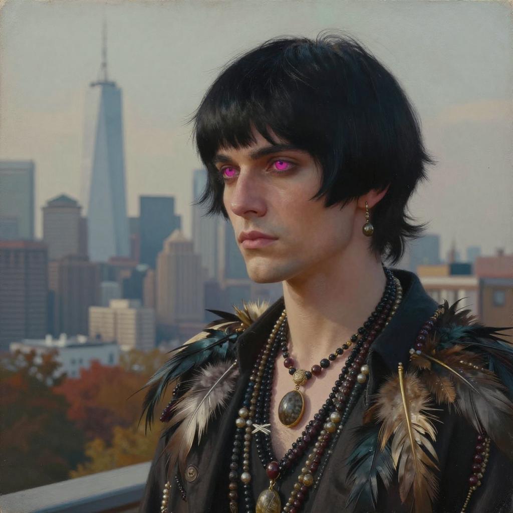 A painting of a city skyline, inkpunkHeavy768, f/1.4, square image, close up film photo, portrait of a male, black short with bangs, magenta eyes, feathers and bead jewelry, elegant pose, atmospheric lighting, cinematic composition, detailed, autumn, filmgenre__