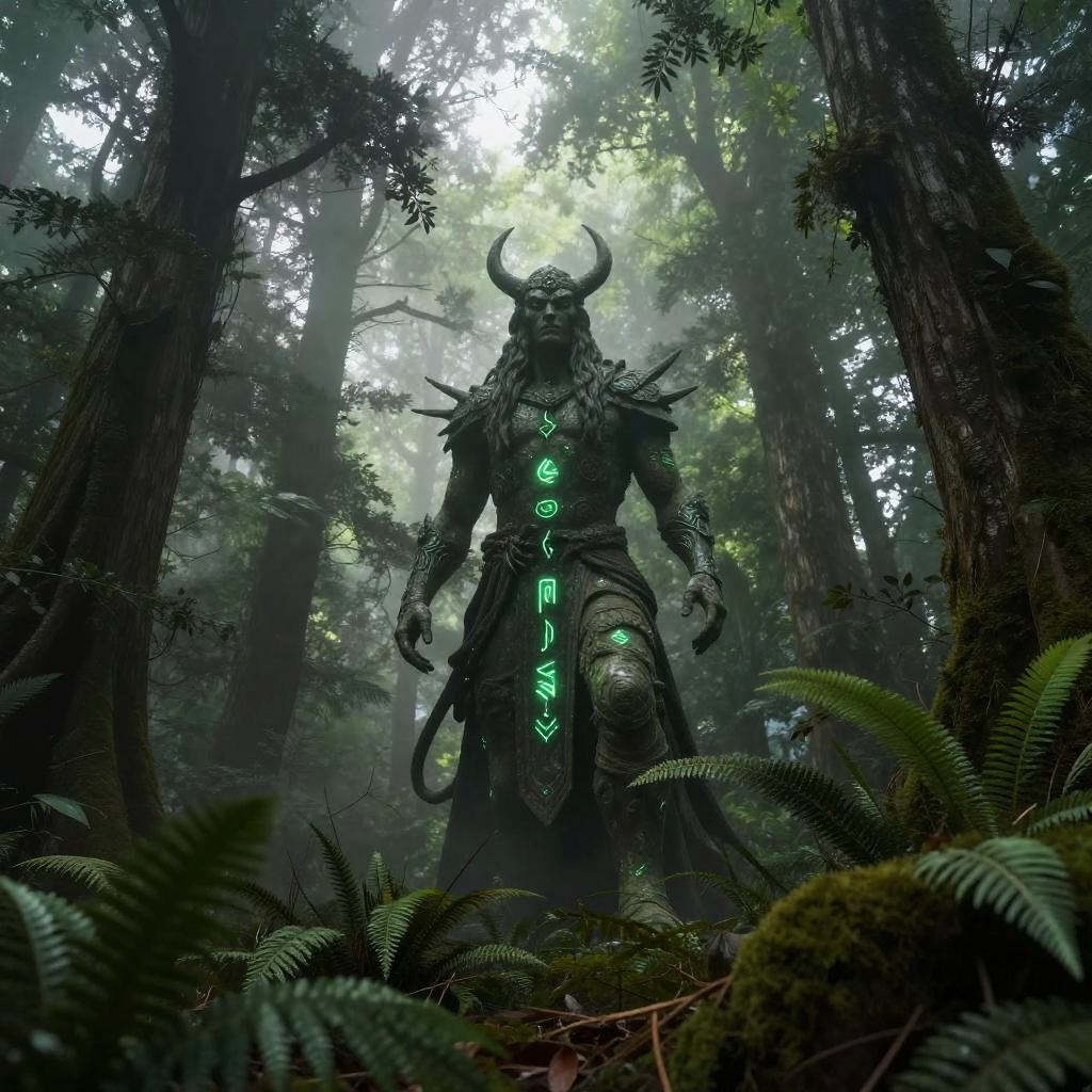 Kan as a mystical forest guardian, standing tall amidst ancient trees with glowing runes, soft ethereal light filtering through dense fog, vibrant green foliage surrounds, fantasy atmosphere, highly detailed and cinematic.