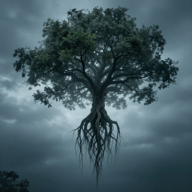 In a realm where gravity defies logic, a spectral tree emerges from the heavens, its roots cascading downward like veins of forgotten dreams, evoking a profound sense of existential wonder and the haunting beauty of inversion.
