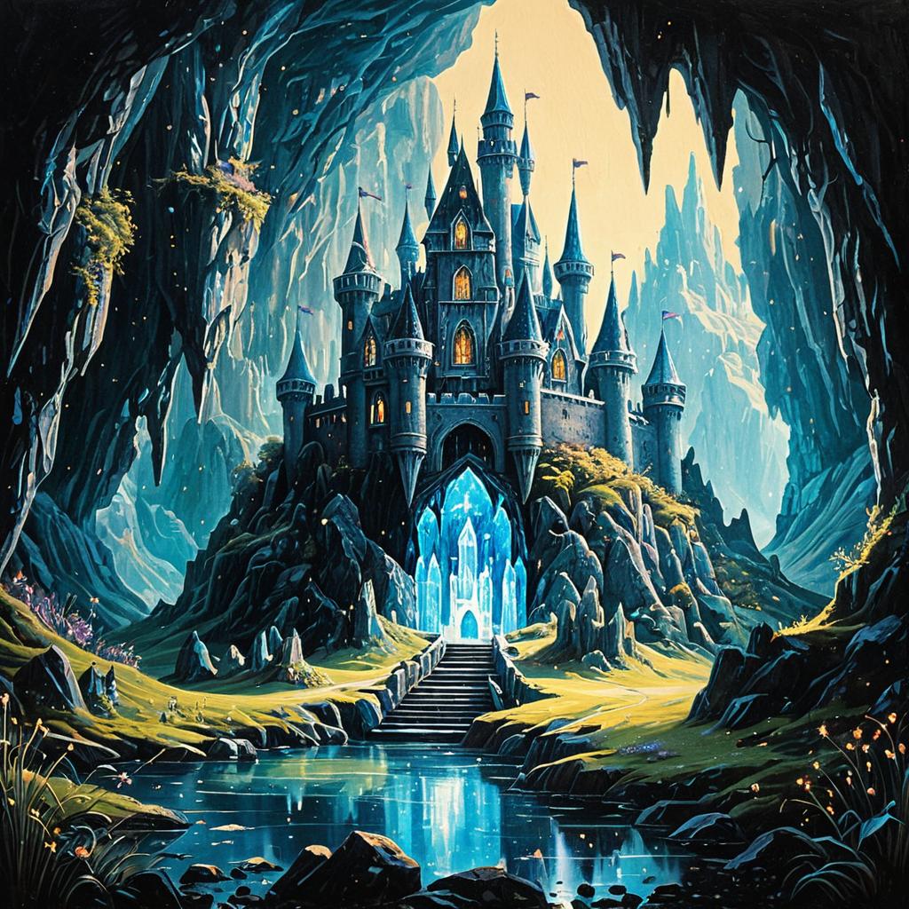 A detailed fantasy painting featuring a majestic castle surrounded by a glowing crystal cave. The castle is set on rocky terrain with multiple spires and turrets, illuminated by warm lights from its windows. The scene includes a reflective body of water in the foreground and is framed by jagged cave walls with glowing crystal formations, creating a magical, fairytale atmosphere.