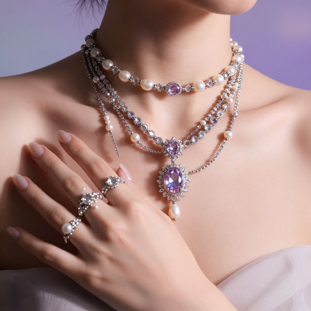 A seductive composition of gem jewels NSFW art, showing intricate necklaces and rings adorning a human form, pearls and diamonds catching light amidst soft shadows, creating a luxurious and alluring atmosphere with a dreamy, ethereal background.