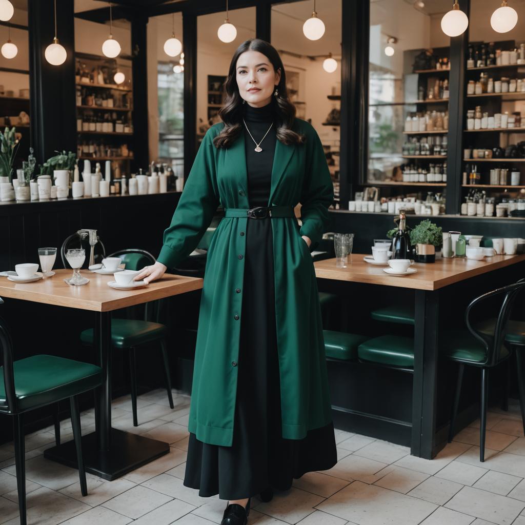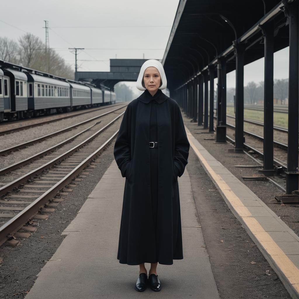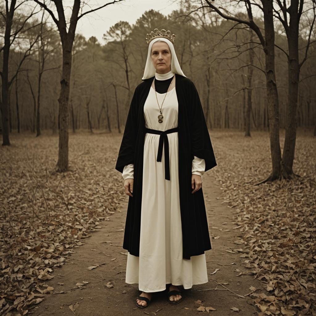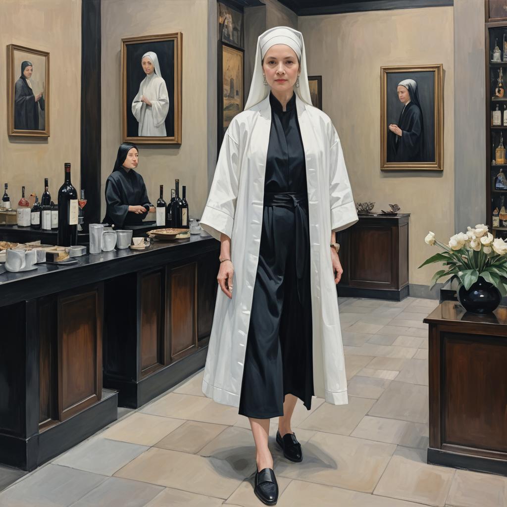 Photo of a Pear-shaped woman, High Bun, nun outfit, black Nylon habit, white Lotus silk coif, long Turquoise robe, modest sandals, old library, Bollywood painting