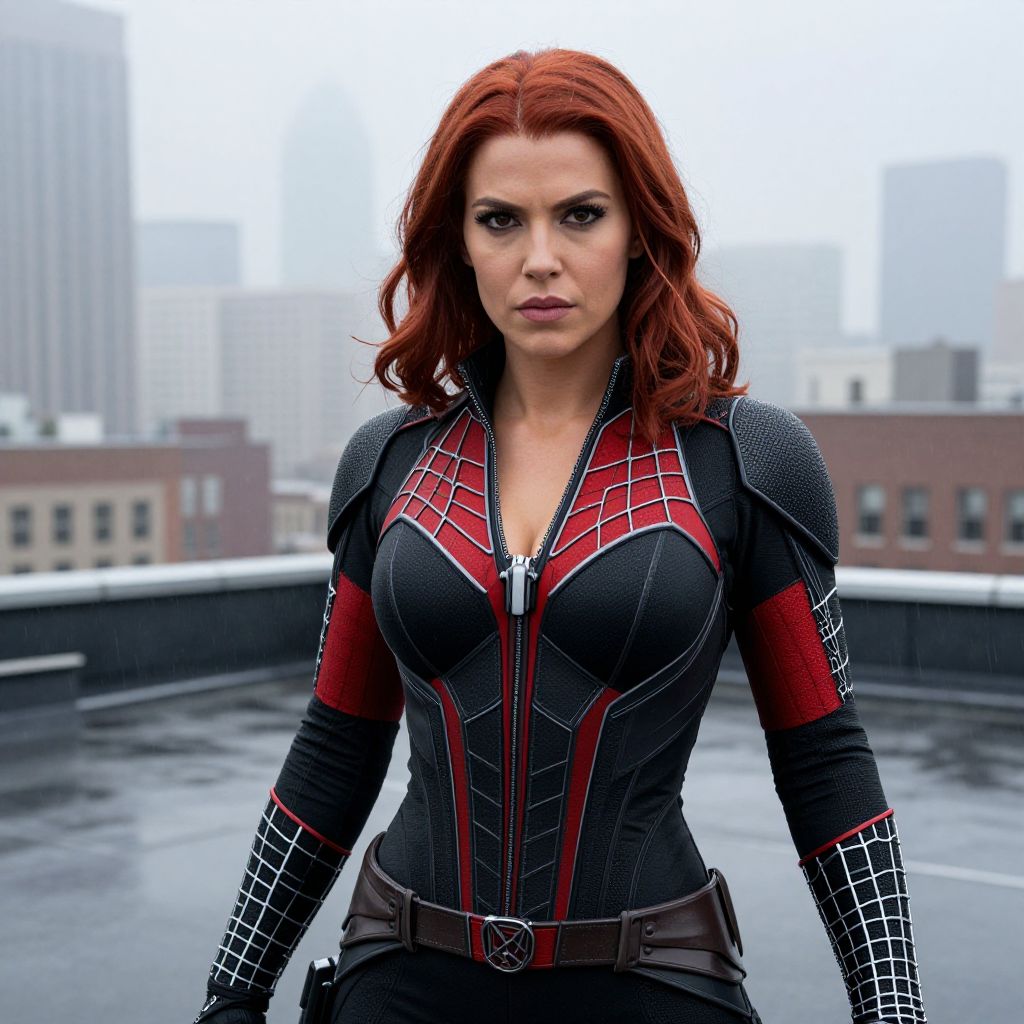 Photograph of a Caucasian woman with striking red hair, styled in loose waves, standing on a rooftop with a foggy cityscape in the background. She wears a form-fitting, black and red Spider-Woman suit with web-patterned sleeves and a V-shaped red design on the chest, accentuating her large breasts. Her expression is determined, with dark eye makeup and pink lipstick. The suit has a zipper down the front, partially open to reveal a hint of cleavage. The rooftop is wet, suggesting recent rain. The image has a slightly overcast, moody atmosphere.