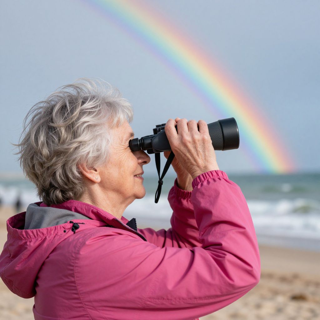 Photograph of an elderly woman with short, gray hair, wearing a pink jacket, holding black binoculars to her eyes, looking towards a beach. A vivid rainbow arcs across a clear blue sky in the background, with the ocean and sandy shore visible. Her focused expression contrasts with the serene, colorful beachscape. The image captures a moment of observation and natural beauty, highlighting the woman's curiosity and the picturesque setting. The photograph emphasizes texture and color, with the woman's jacket and the rainbow standing out against the blurred sea and sand.