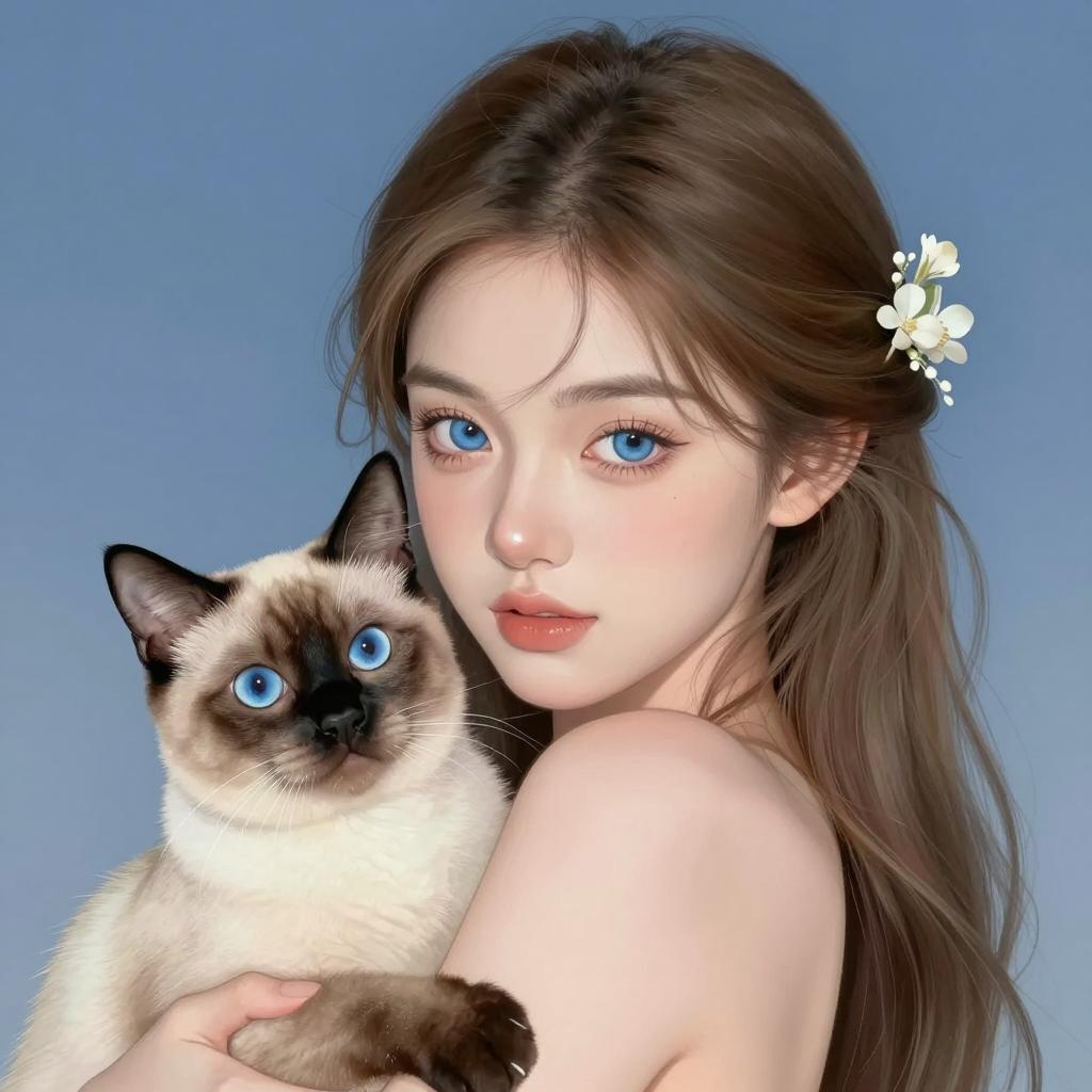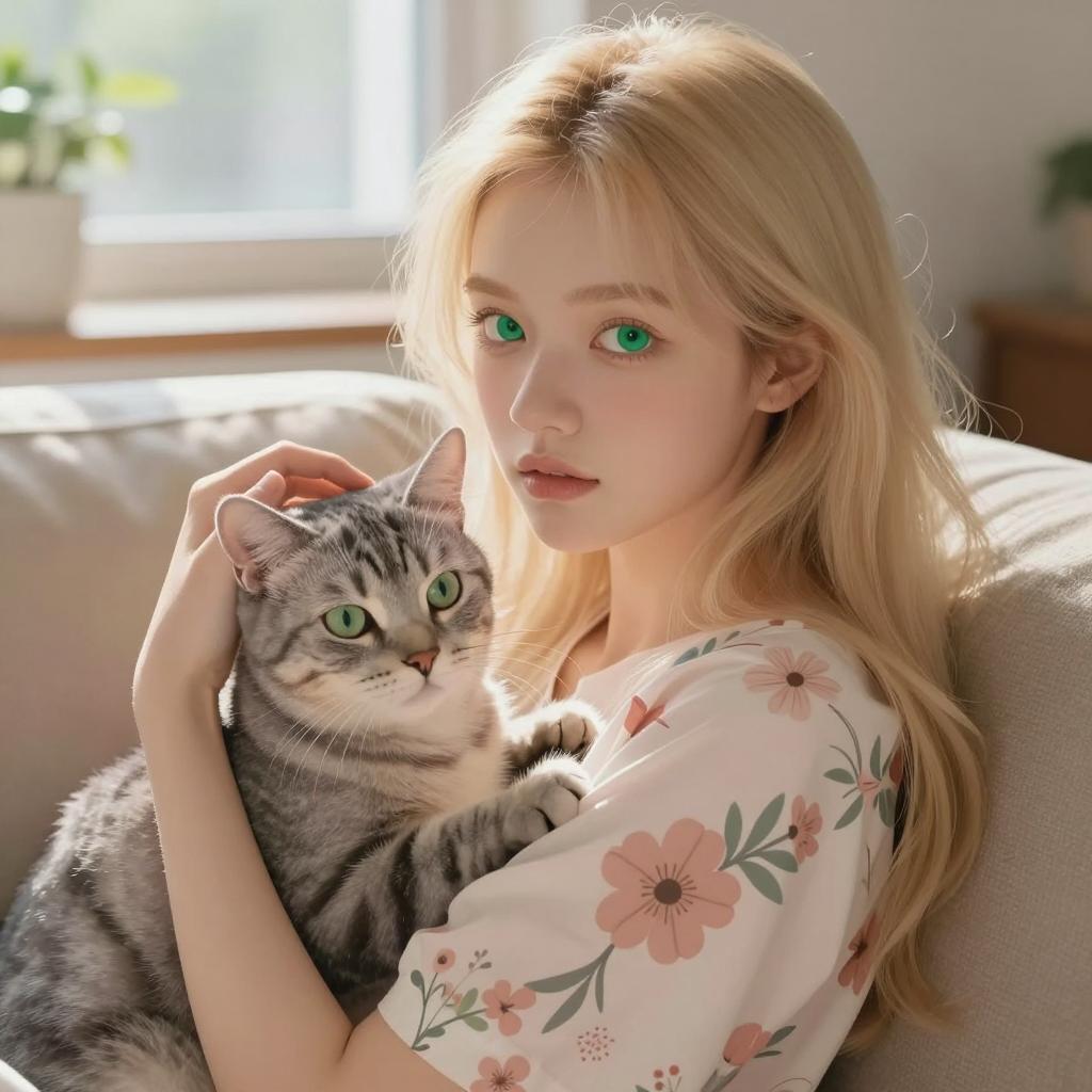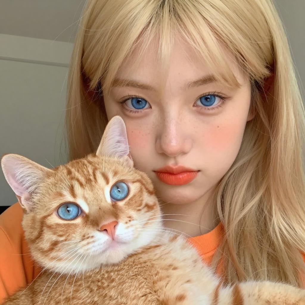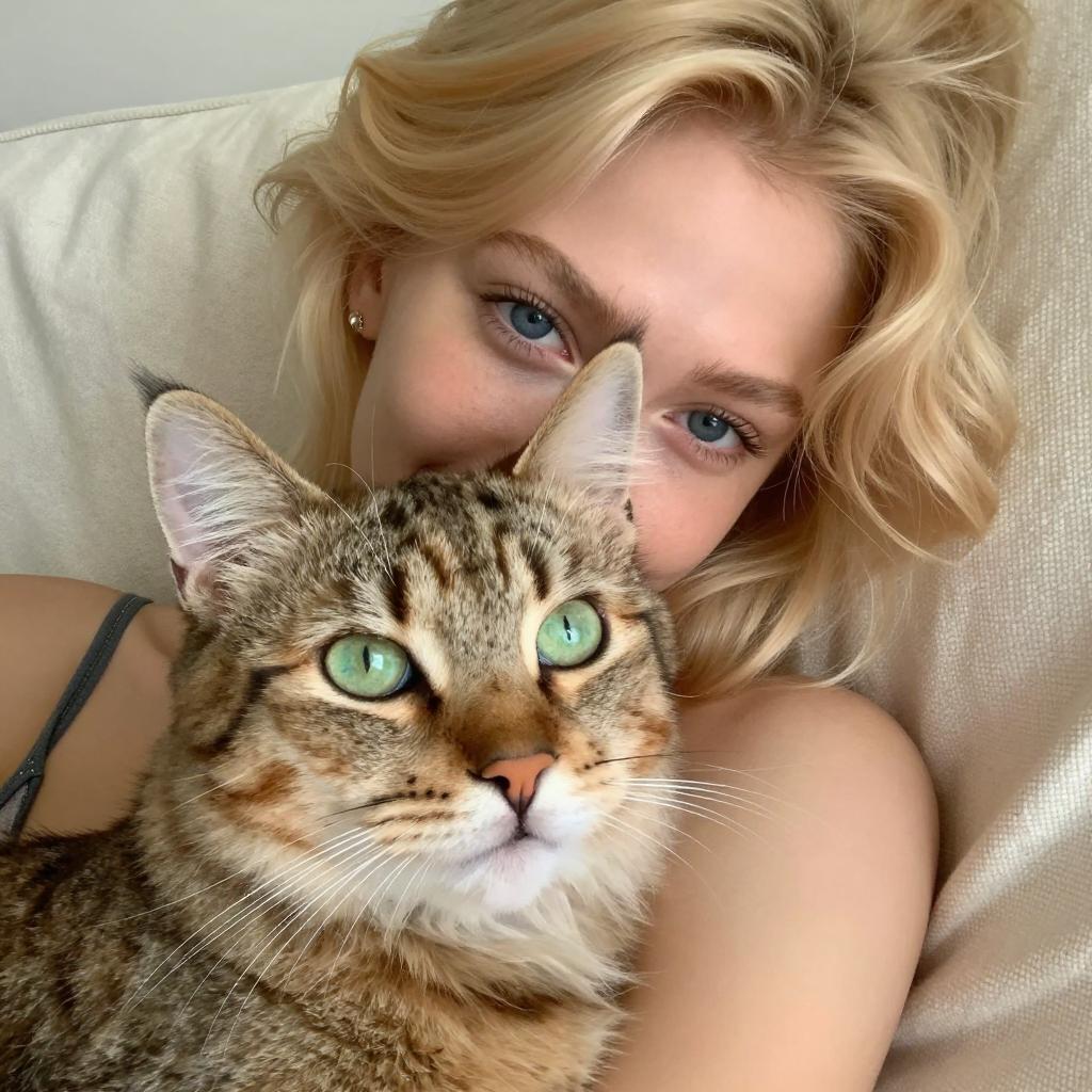 Close-up photograph of a young woman with light brown, wavy hair and blue eyes, holding a small, grey and brown tabby kitten. Her face is close to the kitten's head, both looking at the camera. Her left hand, with a silver ring on her index finger, gently holds the kitten's back. The woman's lips are slightly parted, and her expression is gentle. The kitten's eyes are wide and alert, with its head slightly tilted. Both are in soft, warm lighting.