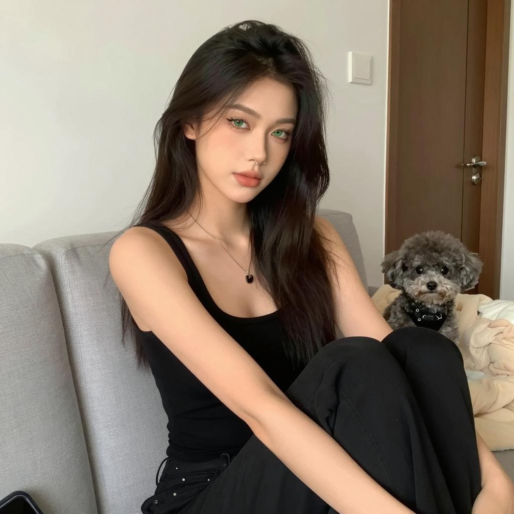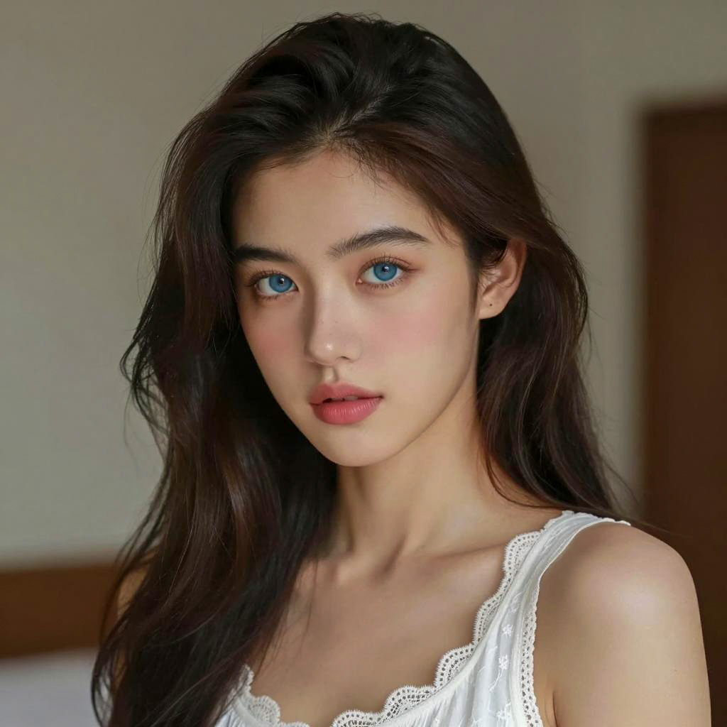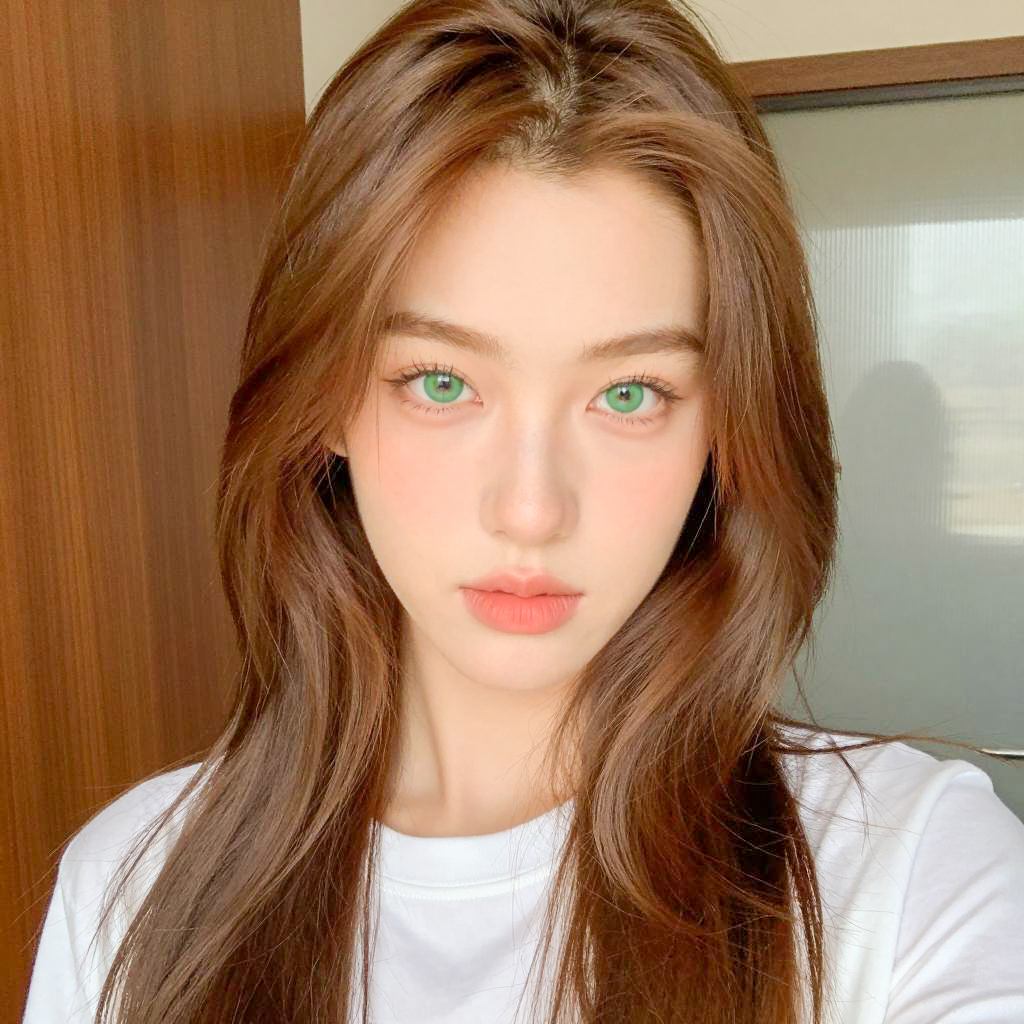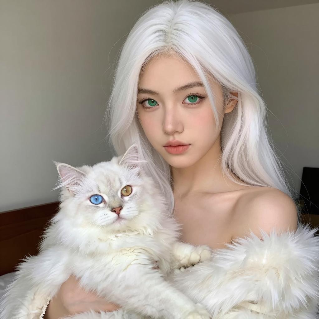 Close-up photograph of a young woman with light brown, wavy hair and blue eyes, holding a small, grey and brown tabby kitten. Her face is close to the kitten's head, both looking at the camera. Her left hand, with a silver ring on her index finger, gently holds the kitten's back. The woman's lips are slightly parted, and her expression is gentle. The kitten's eyes are wide and alert, with its head slightly tilted. Both are in soft, warm lighting.