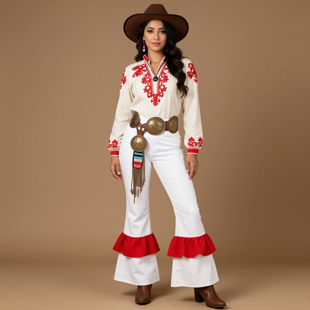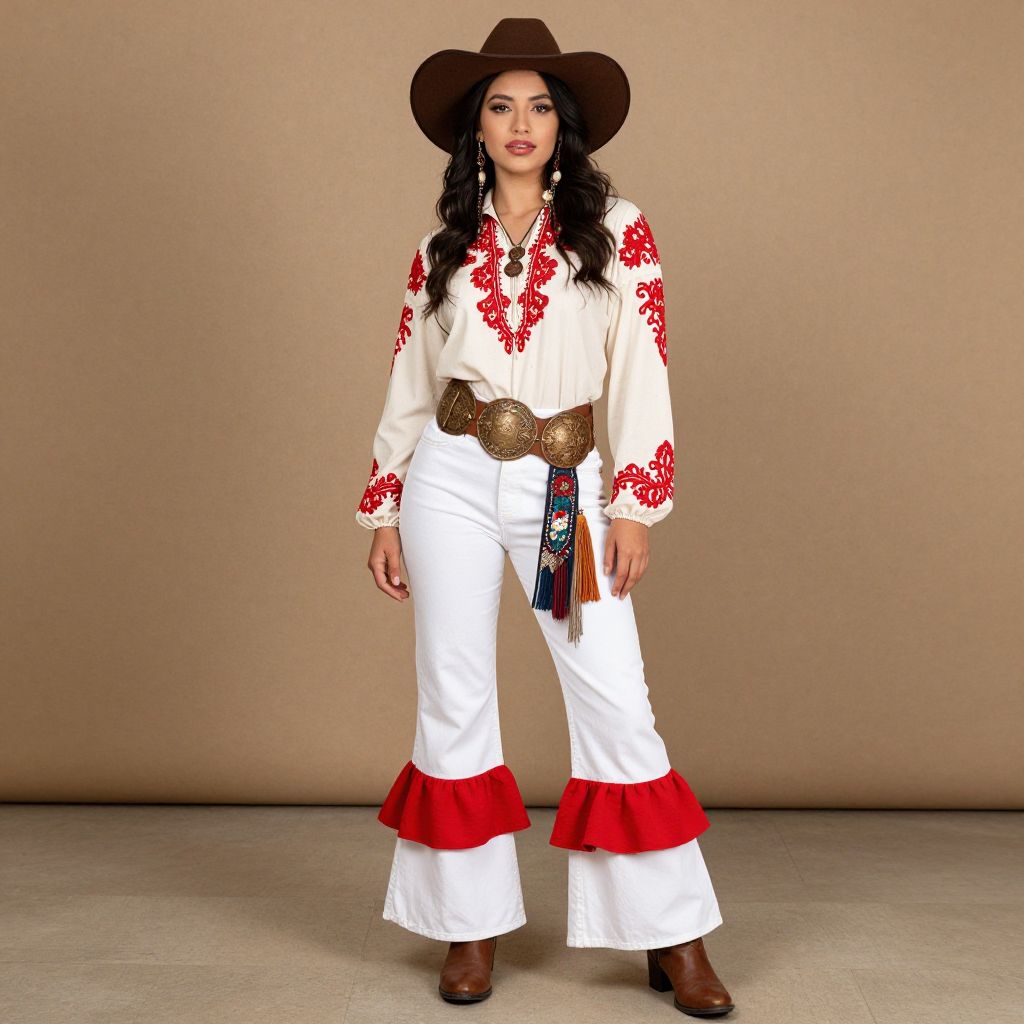 Woman wearing a vibrant Southwestern-inspired costume, featuring a wide-brimmed brown hat, a cream blouse with intricate red embroidery, a brown belt with metallic buckles, flared white pants with red ruffled hems, and brown boots, accessorized with dangling tassels and a decorative sash.