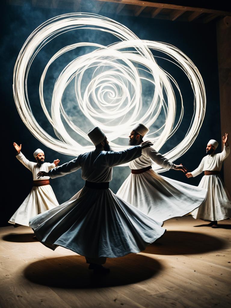 Sufi-inspired whirling dervishes dancing in a glowing spiral of light and dust.