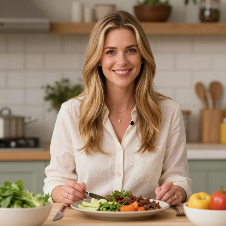 Photograph of a smiling Caucasian woman with long, wavy blonde hair, wearing a white button-up shirt and a delicate necklace. She is seated at a wooden kitchen table, serving a colorful plate of vegetables and meat. The background features a white tiled wall, wooden shelves with various kitchen items, and a green cabinet. Fresh vegetables and fruits are visible on the table, adding vibrant colors. The kitchen is well-lit, creating a warm, inviting atmosphere. The woman's friendly expression and casual attire suggest a home-cooked meal setting.