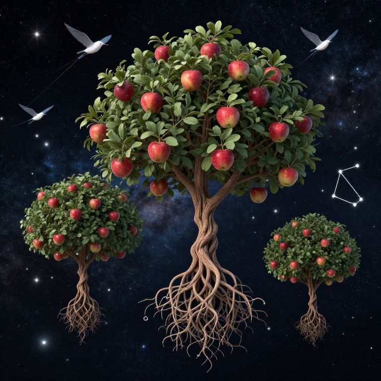 Floating fruit trees drift in zero gravity, roots tangled in constellations while birds made of stardust feast on cosmic apples.