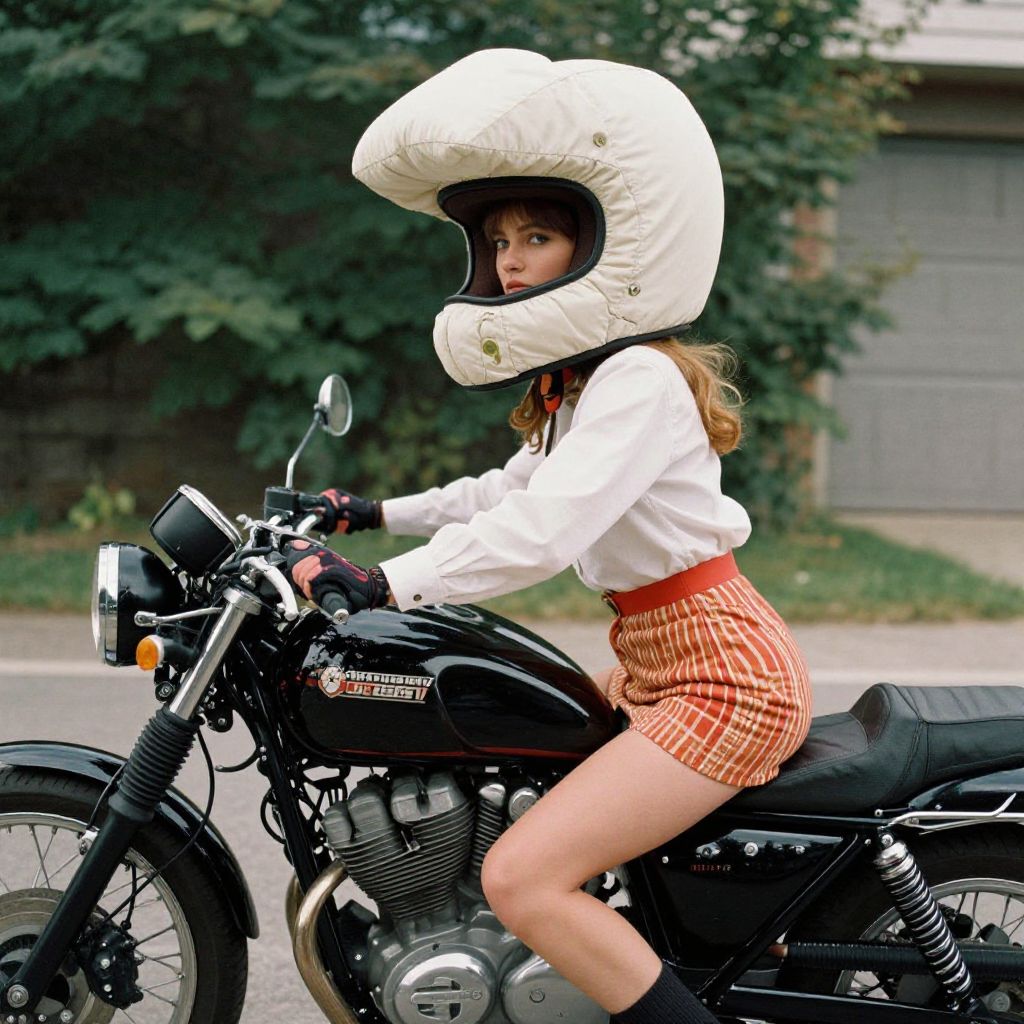 Visual Silence very realistic fashion editorial by wes anderson, inspired in motorcycles, the helmet is made with very big padded fabric, woman model very fashion Kodak portra 800, 35mm style,