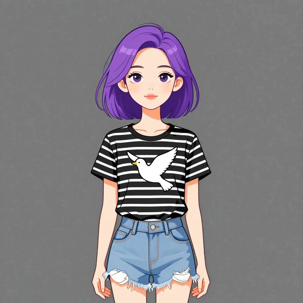 Woman with pretty face and pretty hair. Woman, casual streetwear, black short-sleeved T-shirt with horizontal stripes and a centered white bird graphic, crew neck, light blue denim shorts with a frayed hem, solid gray background. --sref 1467