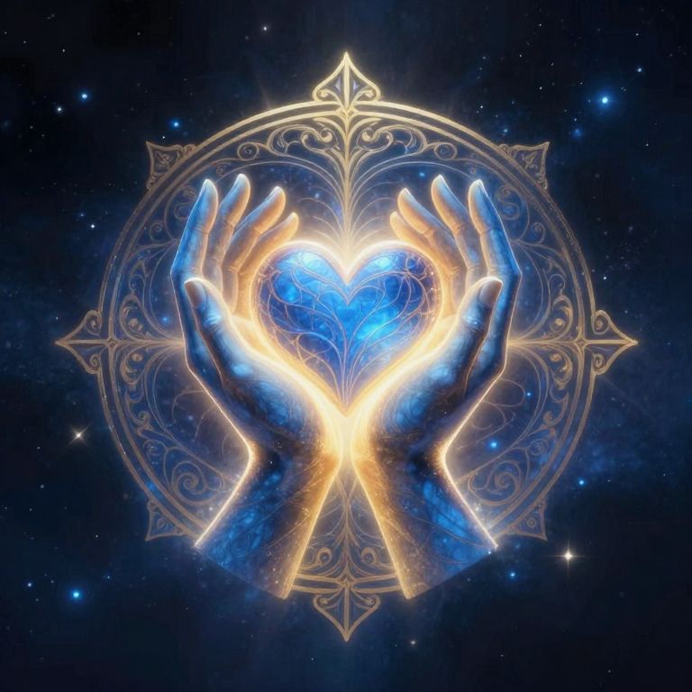 Misericordioso symbol illustrated as an ancient glowing emblem with intertwined hands and hearts, mystical blue and gold hues, surrounded by soft radiant light, floating in a dark celestial background, intricate filigree patterns enhancing divine compassion theme.