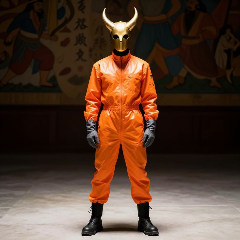 Photograph of a person standing in a brightly lit area, wearing a shiny, orange, full-body jumpsuit with black boots and gray gloves. They have a gold-colored, horned mask covering their face. The background is dimly lit, featuring a colorful, detailed mural with figures and Chinese characters. The person's expression is neutral, and they stand with hands down by their sides.