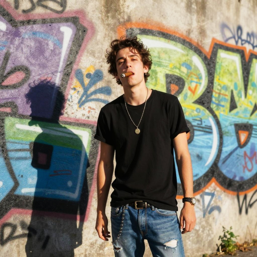 Street-style photo with unlit cigar in mouth of a rebellious youth, urban graffiti wall backdrop, vivid colors, dynamic composition, casual clothing with edgy accessories, late afternoon sunlight casting strong shadows, raw and energetic scene
