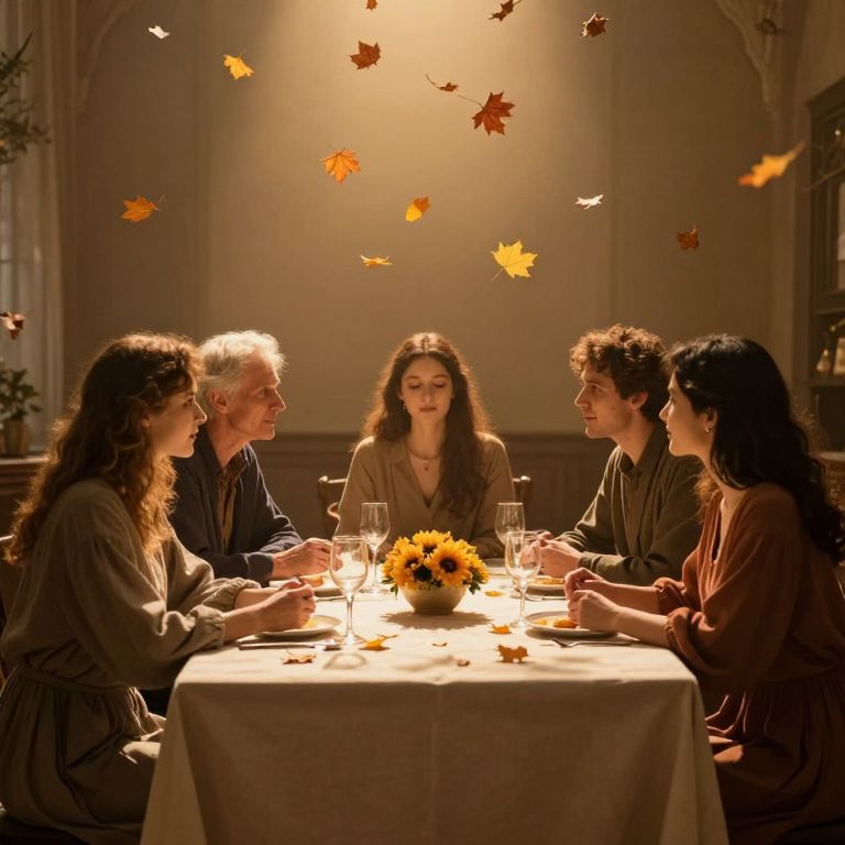 In a timeless chamber bathed in golden light, six souls gather around a table draped in serenity, their whispered conversations suspended in an eternal dance of connection and introspection, as autumn leaves drift silently above, symbolizing the transient beauty of shared moments.